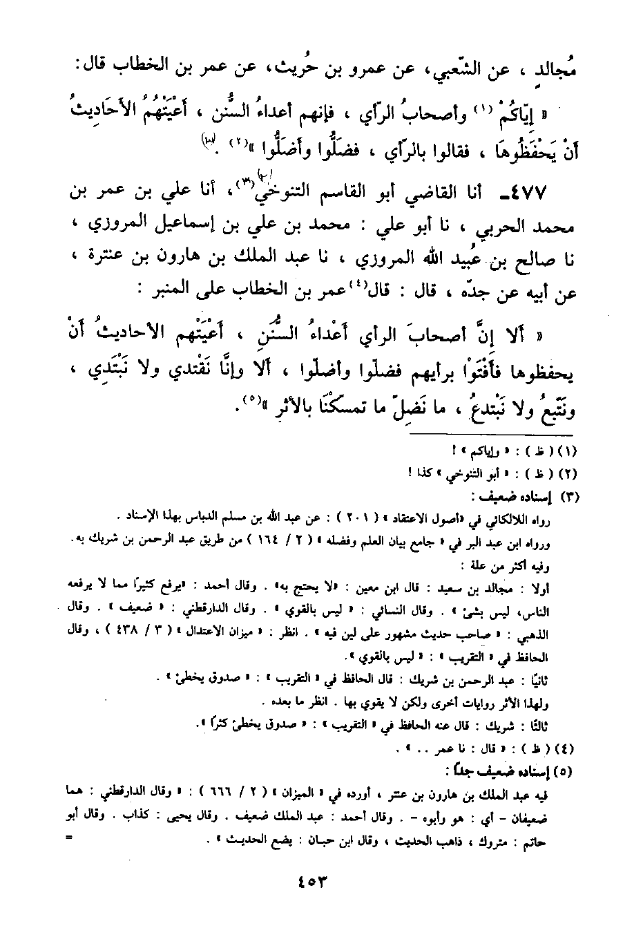 أنا الْقَاضِي أَبُو الْقَاسِمِ التَّنُوخِيُّ , أنا عَلِيُّ بْنُ عُمَرَ بْنِ مُحَمَّدٍ الْحَرْبِيُّ , نا أَبُو عَلِيٍّ , مُحَمَّدُ بْنُ عَلِيِّ بْنِ إِسْمَاعِيلَ الْمَرْوَزِيُّ , نا صَالِحُ بْنُ عُبَيْدِ اللَّهِ الْمَرْوَزِيُّ , نا عَبْدُ الْمَلِكِ بْنُ هَارُونَ بْنِ عَنْتَرَةَ , عَنْ أَبِيهِ , عَنْ جَدِّهِ , قَالَ: قَالَ عُمَرُ بْنُ الْخَطَّابِ عَلَى الْمِنْبَرِ: «أَلَا إِنَّ أَصْحَابَ الرَّأْيِ أَعْدَاءُ السُّنَنِ , أَعْيَتْهُمُ الْأَحَادِيثُ أَنْ يَحْفَظُوهَا فَأَفْتَوْا بِرَأْيِهِمْ فَضَلُّوا وَأَضَلُّوا , أَلَا وَإِنَّا نَقْتَدِي وَلَا نَبْتَدِي , وَنَتَّبِعُ وَلَا نَبْتَدِعُ , مَا نَضِلُّ مَا تَمَسَّكْنَا بِالْأَثَرِ»