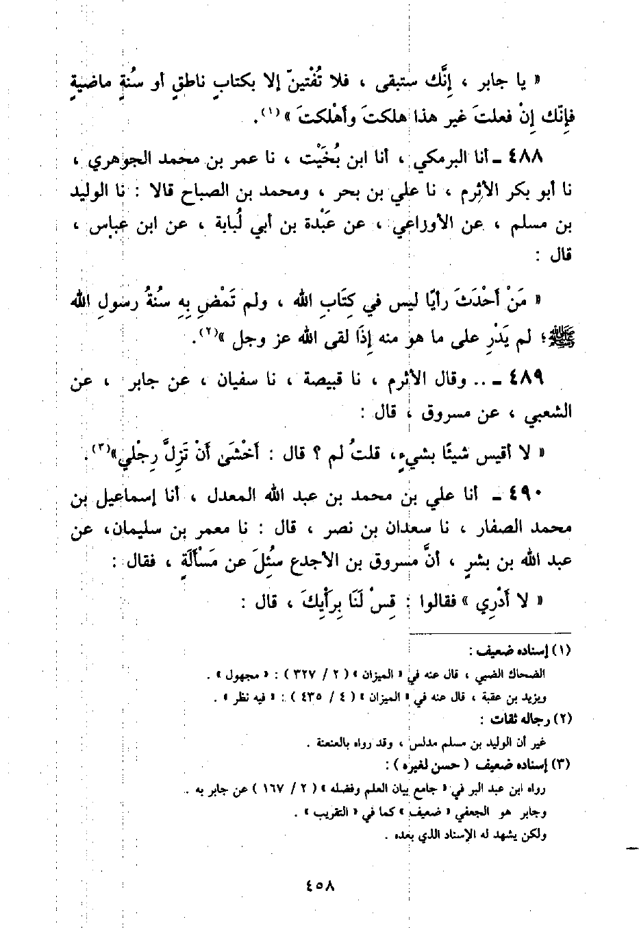 أنا عَلِيُّ بْنُ مُحَمَّدِ بْنِ عَبْدِ اللَّهِ الْمُعَدِّلُ , أنا إِسْمَاعِيلُ بْنُ مُحَمَّدٍ الصَّفَّارُ , نا سَعْدَانُ بْنُ نَصْرٍ , قَالَ: نا مَعْمَرُ بْنُ سُلَيْمَانَ , عَنْ عَبْدِ اللَّهِ بْنِ بِشْرٍ , أَنَّ مَسْرُوقَ بْنَ الْأَجْدَعِ , سُئِلَ عَنْ مَسْأَلَةٍ , فَقَالَ: «لَا أَدْرِي» فَقَالُوا: قِسْ لَنَا بِرَأْيِكَ قَالَ ⦗٤٥٩⦘: «أَخَافُ أَنْ تَزِلَّ قَدَمَيَّ»