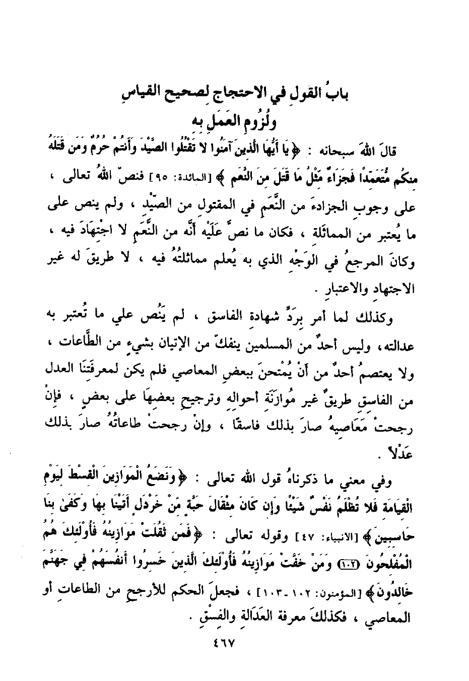 بَابُ الْقَوْلِ فِي الِاحْتِجَاجِ لَصَحِيحِ الْقِيَاسِ وَلُزُومِ الْعَمَلِ بِهِ قَالَ اللَّهُ سُبْحَانَهُ: {يَا أَيُّهَا الَّذِينَ آمَنُوا لَا تَقْتُلُوا الصَّيْدَ وَأَنْتُمْ حُرُمٌ وَمَنْ قَتَلَهُ مِنْكُمْ مُتَعَمِّدًا فَجَزَاءٌ مِثْلُ مَا قَتَلَ مِنَ النَّعَمِ} [المائدة: ٩٥] فَنَصَّ اللَّهُ تَعَالَى عَلَى وُجُوبِ الْجَزَاءِ مِنَ النَّعَمِ فِي الْمَقْتُولِ مِنَ الصَّيْدِ , وَلَمْ يَنُصَّ عَلَى مَا يُعْتَبَرُ مِنَ الْمُمَاثَلَةِ , فَكَانَ مَا نَصَّ عَلَيْهِ أَنَّهُ مِنَ النَّعَمِ لَا اجْتِهَادَ فِيهِ , وَكَانَ الْمَرْجِعُ فِي الْوَجْهِ الَّذِي بِهِ يُعْلَمُ مُمَاثَلَتُهُ فِيهِ , لَا طَرِيقَ لَهُ غَيْرُ الِاجْتِهَادِ وَالِاعْتِبَارِ وَكَذَلِكَ لَمَّا أَمَرَ بِرَدِّ شَهَادَةِ الْفَاسِقِ , لَمْ يَنُصَّ عَلَى مَا تُعْتَبَرُ بِهِ عَدَالَتُهُ , وَلَيْسَ أَحَدٌ مِنَ الْمُسْلِمِينَ يَنْفَكُّ مِنَ الْإِتْيَانِ بِشَيْءٍ مِنَ الطَّاعَاتِ , وَلَا يَعْتَصِمُ أَحَدٌ مِنْ أَنْ يُمْتَحَنَ بِبَعْضِ الْمَعَاصِي فَلَمْ يَكُنْ لِمَعْرِفَتِنَا الْعَدْلَ مِنَ الْفَاسِقِ طَرِيقٌ غَيْرُ مُوَازَنَةِ أَحْوَالِهِ وَتَرْجِيحِ بَعْضِهَا عَلَى بَعْضٍ , فَإِنْ رَجُحَتْ مَعَاصِيهِ صَارَ بِذَلِكَ فَاسِقًا , وَإِنْ رَجُحَتْ طَاعَاتُهُ صَارَ بِذَلِكَ عَدْلًا وَفِي مَعْنَى مَا ذَكَرْنَاهُ قَوْلُ اللَّهِ تَعَالَى: {وَنَضَعُ الْمَوَازِينَ الْقِسْطَ لِيَوْمِ الْقِيَامَةِ فَلَا تُظْلَمُ نَفْسٌ شَيْئًا وَإِنْ كَانَ مِثْقَالَ حَبَّةٍ مِنْ خَرْدَلٍ أَتَيْنَا بِهَا وَكَفَى بِنَا حَاسِبِينَ} [الأنبياء: ٤٧] وَقَوْلُهُ تَعَالَى: {فَمَنْ ثَقُلَتْ مَوَازِينُهُ فَأُولَئِكَ هُمُ الْمُفْلِحُونَ , وَمَنْ خَفَّتْ مَوَازِينُهُ فَأُولَئِكَ الَّذِينَ خَسِرُوا أَنْفُسَهُمْ فِي جَهَنَّمَ خَالِدُونَ} [المؤمنون: ١٠٣] فَجَعَلَ الْحُكْمَ لِلْأَرْجَحِ مِنَ الطَّاعَاتِ أَوِ الْمَعَاصِي , فَكَذَلِكَ مَعْرِفَةُ الْعَدَالَةِ وَالْفِسْقِ