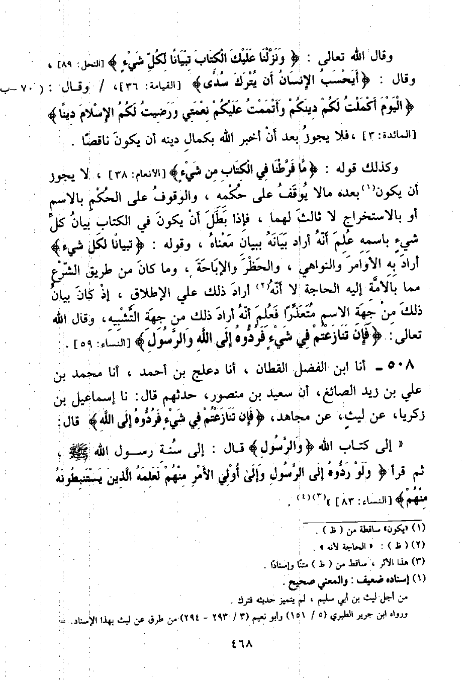 وَقَالَ اللَّهُ تَعَالَى: {وَنَزَّلْنَا عَلَيْكَ الْكِتَابَ تِبْيَانًا لِكُلِّ شَيْءٍ} [النحل: ٨٩] , وَقَالَ: {أَيَحْسَبُ الْإِنْسَانُ أَنْ يُتْرَكَ سُدًى} [القيامة: ٣٦] , وَقَالَ: {الْيَوْمَ أَكْمَلْتُ لَكُمْ دِينَكُمْ وَأَتْمَمْتُ عَلَيْكُمْ نِعْمَتِي وَرَضِيتُ لَكُمُ الْإِسْلَامَ دِينًا} [المائدة: ٣] , فَلَا يَجُوزُ بَعْدَ أَنْ أَخْبَرَ اللَّهُ بِكَمَالِ دِينِهِ أَنْ يَكُونَ نَاقِصًا وَكَذَلِكَ قَوْلُهُ: {مَا فَرَّطْنَا فِي الْكِتَابِ مِنْ شَيْءٍ} [الأنعام: ٣٨] , وَلَا يَجُوزُ أَنْ يَكُونَ بَعْدَهُ مَا لَا يُوقَفُ عَلَى حُكْمِهِ , وَالْوُقُوفُ عَلَى الْحُكْمِ بِالِاسْمِ أَوْ بِالِاسْتِخْرَاجِ لَا ثَالِثَ لَهُمَا , فَإِذَا بَطَلَ أَنْ يَكُونَ فِي الْكِتَابِ بَيَانُ كُلِّ شَيْءٍ بِاسْمِهِ عُلِمَ أَنَّهُ أَرَادَ بَيَانَهُ بِبَيَانِ مَعْنَاهُ , وَقَوْلُهُ: {تِبْيَانًا لِكُلِّ شَيْءٍ} [النحل: ٨٩] أَرَادَ بِهِ الْأَوَامِرَ وَالنَّوَاهِيَ , وَالْحَظْرَ وَالْإِبَاحَةَ , وَمَا كَانَ مِنْ طَرِيقِ الشَّرْعِ مِمَّا بِالْأُمَّةِ إِلَيْهِ الْحَاجَةُ لَا أَنَّهُ أَرَادَ ذَلِكَ عَلَى الْإِطْلَاقِ , إِذْ كَانَ بَيَانُ ذَلِكَ مِنْ جِهَةِ الِاسْمِ مُتَعَذِّرًا فَعُلِمَ أَنَّهُ أَرَادَ ذَلِكَ مِنْ جِهَةِ التَّشْبِيهِ , وَقَالَ اللَّهُ تَعَالَى: {فَإِنْ تَنَازَعْتُمْ فِي شَيْءٍ فَرُدُّوهُ إِلَى اللَّهِ وَالرَّسُولِ} [النساء: ٥٩]