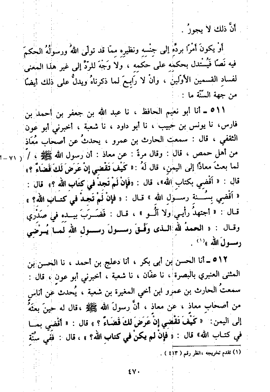 أنا الْحَسَنُ بْنُ أَبِي بَكْرٍ , أنا دَعْلَجُ بْنُ أَحْمَدَ , نا الْحَسَنُ بْنُ الْمُثَنَّى الْعَنْبَرِيُّ , بِالْبَصْرَةِ , نا عَفَّانُ , نا شُعْبَةُ , أَخْبَرَنِي أَبُو عَوْنٍ , قَالَ: سَمِعْتُ الْحَارِثَ بْنَ عَمْرٍو ابْنُ أَخِي الْمُغِيرَةِ بْنِ شُعْبَةَ , يُحَدِّثُ عَنْ أُنَاسٍ , مِنْ أَصْحَابِ مُعَاذٍ , عَنْ مُعَاذٍ , أَنَّ رَسُولَ اللَّهِ صَلَّى اللهُ عَلَيْهِ وَسَلَّمَ قَالَ لَهُ حِينَ بَعَثَهُ إِلَى الْيَمَنِ: «كَيْفَ تَقْضِي إِنْ عَرَضَ لَكَ قَضَاءٌ؟» قَالَ: أَقْضِي بِمَا فِي كِتَابِ اللَّهِ قَالَ: «فَإِنْ لَمْ يَكُنْ فِي كِتَابِ اللَّهِ؟» قَالَ: فَفِي سَنَةِ ⦗٤٧١⦘ رَسُولِ اللَّهِ قَالَ: «فَإِنْ لَمْ يَكُنْ فِي سَنَةِ رَسُولِ اللَّهِ؟» قَالَ: أَجْتَهِدُ رَأْيِي لَا آلُو قَالَ: فَضَرَبَ - يَعْنِي صَدْرَهُ - وَقَالَ: «الْحَمْدُ لِلَّهِ الَّذِي وَفَّقَ رَسُولَ رَسُولِ اللَّهِ لَمَّا يُرْضِي رَسُولَ اللَّهِ»