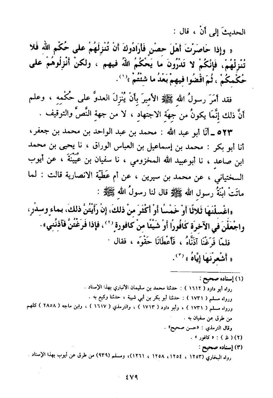 أنا أَبُو عَبْدِ اللَّهِ , مُحَمَّدُ بْنُ عَبْدِ الْوَاحِدِ بْنِ مُحَمَّدِ بْنِ جَعْفَرٍ , أنا أَبُو بَكْرٍ , مُحَمَّدُ بْنُ إِسْمَاعِيلَ بْنِ الْعَبَّاسِ الْوَرَّاقُ , نا يَحْيَى بْنُ مُحَمَّدٍ بْنُ صَاعِدٍ , نا أَبُو عُبَيْدٍ اللَّهِ الْمَخْزُومِيُّ , نا سُفْيَانُ بْنُ عُيَيْنَةَ , عَنْ أَيُّوبَ السَّخْتِيَانِيِّ , عَنْ مُحَمَّدِ بْنِ سِيرِينَ , عَنْ أُمِّ عَطِيَّةَ الْأَنْصَارِيَّةِ , قَالَتْ: لَمَّا مَاتَتِ ابْنَةُ رَسُولِ اللَّهِ صَلَّى اللهُ عَلَيْهِ وَسَلَّمَ قَالَ لَنَا رَسُولُ اللَّهِ صَلَّى اللهُ عَلَيْهِ وَسَلَّمَ: «اغْسِلْنَهَا ثَلَاثًا أَوْ خَمْسًا أَوْ أَكْثَرَ مِنْ ذَلِكَ , إِنْ رَأَيْتُنَّ ذَلِكَ , بِمَاءٍ وَسِدْرٍ , وَاجْعَلْنَ فِي الْآخِرَةِ كَافُورًا أَوْ شَيْئًا مِنْ كَافُورٍ , فَإِذَا فَرَغْتُنَّ فَآذِنَّنِي» فَلَمَّا فَرَغْنَا آذَنَّاهُ , فَأَعْطَانَا حَقْوَهُ , فَقَالَ: «أَشْعِرْنَهَا إِيَّاهُ» ⦗٤٨٠⦘ قُلْتُ: وَغُسْلُ الْمَيِّتِ فَرْضٌ , وَقَدْ جَعَلَ النَّبِيُّ صَلَّى اللهُ عَلَيْهِ وَسَلَّمَ الْأَمْرَ فِيهِ إِلَى اجْتِهَادِ مَنْ وَلِيَ الْغُسْلَ وَرَأْيِهِ، وَقَد حَكَمَ جَمَاعَةٌ مِنَ الصَّحَابَةِ بِاجْتِهَادِهِمْ فِي وَقْتِ النَّبِيِّ صَلَّى اللهُ عَلَيْهِ وَسَلَّمَ , فَلَمْ يُنْكِرْ ذَلِكَ عَلَيْهِمْ , وَلَا عَنَّفَ أَحَدًا مِنْهُمْ