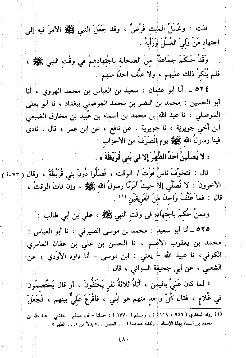 أنا أَبُو عُثْمَانَ , سَعِيدُ بْنُ الْعَبَّاسِ بْنِ مُحَمَّدٍ الْهَرَوِيُّ , أنا أَبُو الْحُسَيْنِ , مُحَمَّدُ بْنُ النَّضْرِ بْنِ مُحَمَّدٍ الْمَوْصِلِيُّ بِبَغْدَادَ , نا أَبُو يَعْلَى الْمَوْصِلِيُّ , نا عَبْدُ اللَّهِ بْنُ مُحَمَّدِ بْنِ أَسْمَاءَ بْنِ عُبَيْدِ بْنِ مُخَارِقٍ الضُّبَعِيِّ ابْنُ أَخِي جُوَيْرِيَةَ , نا جُوَيْرِيَةُ , عَنْ نَافِعٍ , عَنِ ابْنِ عُمَرَ , قَالَ: نَادَى فِينَا رَسُولُ اللَّهِ صَلَّى اللهُ عَلَيْهِ وَسَلَّمَ يَوْمَ انْصَرَفَ مِنَ الْأَحْزَابِ: «لَا يُصَلِّيَنَّ أَحَدٌ الظُّهْرَ إِلَّا فِي بَنِي قُرَيْظَةِ» قَالَ: فَتَخَوَّفَ نَاسٌ فَوْتَ الْوَقْتِ , فَصَلُّوا دُونَ بَنِي قُرَيْظَةَ , وَقَالَ الْآخَرُونَ: لَا نُصَلِّي إِلَّا حَيْثُ أَمَرَنَا رَسُولُ اللَّهِ صَلَّى اللهُ عَلَيْهِ وَسَلَّمَ , وَإِنْ فَاتَ الْوَقْتُ قَالَ: فَمَا عَنَّفَ وَاحِدًا مِنَ الْفَرِيقَيْنِ وَمِمَّنْ حَكَمَ بِاجْتِهَادِهِ فِي وَقْتِ النَّبِيِّ صَلَّى اللهُ عَلَيْهِ وَسَلَّمَ , عَلِيُّ بْنُ أَبِي طَالِبٍ