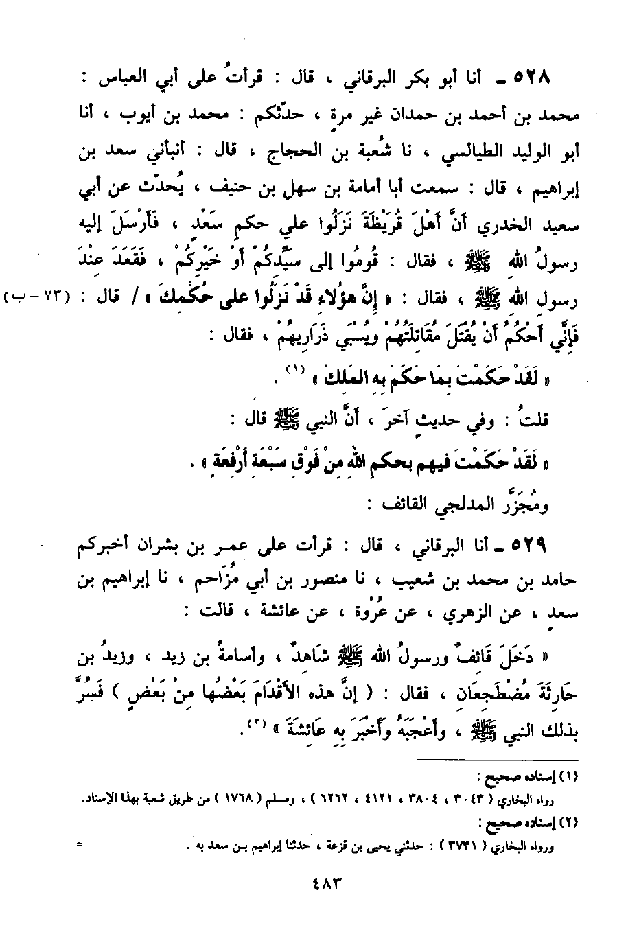 وَمُجَزَّرٌ الْمُدْلِجِيُّ الْقَائِفُ أنا الْبُرْقَانِيُّ , قَالَ: قَرَأْتُ عَلَى عُمَرَ بْنِ بِشْرَانَ أَخْبَرَكُمْ حَامِدُ بْنُ مُحَمَّدِ بْنِ شُعَيْبٍ , نا مَنْصُورُ بْنُ أَبِي مُزَاحِمٍ , نا إِبْرَاهِيمُ بْنُ سَعْدٍ , عَنِ الزُّهْرِيِّ , عَنْ عُرْوَةَ , عَنْ عَائِشَةَ , قَالَتْ: دَخَلَ قَائِفٌ وَرَسُولُ اللَّهِ صَلَّى اللهُ عَلَيْهِ وَسَلَّمَ شَاهِدٌ , وَأُسَامَةُ بْنُ زَيْدٍ , وَزَيْدُ بْنُ حَارِثَةَ مُضْطَجِعَانِ , فَقَالَ: " إِنَّ هَذِهِ الْأَقْدَامُ بَعْضُهَا مِنْ بَعْضٍ فَسَّرَ بِذَلِكَ النَّبِيُّ صَلَّى اللهُ عَلَيْهِ وَسَلَّمَ , وَأَعْجَبَهُ وَأَخْبَرَ بِهِ عَائِشَةَ ⦗٤٨٤⦘ قُلْتُ: كَانَ زَيْدٌ أَبْيَضَ وَابْنُهُ أُسَامَةُ أَسْوَدَ , فَكَانَ فَرَحُ النَّبِيِّ صَلَّى اللهُ عَلَيْهِ وَسَلَّمَ وَسُرُورُهُ , إِذْ شَبَّهَ الْقَائِفُ قَدَمَ أُسَامَةَ بِقَدَمِ زَيْدٍ وَأَلْحَقَ الْفَرْعَ بِنَظِيرِهِ مِنَ الْأَصْلِ , فَأَصَابَ فِي اجْتِهَادِهِ , وَالنَّبِيُّ صَلَّى اللهُ عَلَيْهِ وَسَلَّمَ لَا يُسِرُّ إِلَّا بِالْحَقِّ وَقَدْ ثَبَتَ عَنْ رَسُولِ اللَّهِ صَلَّى اللهُ عَلَيْهِ وَسَلَّمَ أَنَّهُ أَخْبَرَ عَنْ حُكْمِ بَعْضِ أَنْبِيَاءِ اللَّهِ بِالِاجْتِهَادِ