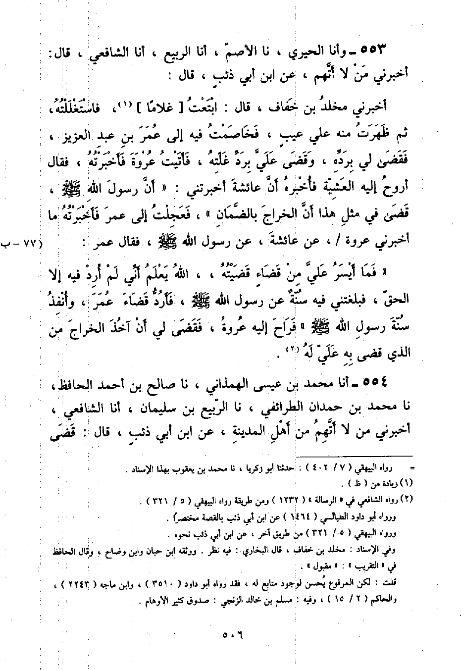 وَأَنَا الْحِيرِيُّ , نا الْأَصَمُّ , أنا الرَّبِيعُ , أنا الشَّافِعِيُّ , قَالَ: أَخْبَرَنِي مَنْ , لَا أَتَّهِمُ , عَنِ ابْنِ أَبِي ذِئْبٍ , قَالَ: أَخْبَرَنِي مَخْلَدُ بْنُ خُفَافٍ , قَالَ: ابْتَعْتُ غُلَامًا , فَاسْتَغْلَلْتُهُ , ثُمَّ ظَهَرَتْ مِنْهُ عَلَيَّ عَيْبٌ , فَخَاصَمْتُ فِيهِ إِلَى عُمَرَ بْنِ عَبْدِ الْعَزِيزِ , فَقَضَى لِي بِرَدِّهِ , وَقَضَى عَلَيَّ بِرَدِّ غَلَّتِهِ , فَأَتَيْتُ عُرْوَةَ فَأَخْبَرْتُهُ , فَقَالَ أَرُوحُ إِلَيْهِ الْعَشِيَّةَ فَأُخْبِرُهُ أَنَّ عَائِشَةَ أَخْبَرَتْنِي: «أَنَّ رَسُولَ اللَّهِ صَلَّى اللهُ عَلَيْهِ وَسَلَّمَ قَضَى فِي مِثْلِ هَذَا أَنَّ الْخَرَاجَ بِالضَّمَانِ» , فَعُجِّلْتُ إِلَى عُمَرَ فَأَخْبَرْتُهُ مَا أَخْبَرَنِي عُرْوَةُ , عَنْ عَائِشَةَ , عَنْ رَسُولِ اللَّهِ صَلَّى اللهُ عَلَيْهِ وَسَلَّمَ , فَقَالَ عُمَرُ: فَمَا أَيْسَرَ عَلَيَّ مِنْ قَضَاءٍ قَضَيْتُهُ , اللَّهُ يَعْلَمُ أَنِّي لَمْ أُرِدْ فِيهِ إِلَّا الْحَقَّ , فَبَلَغَتْنِي فِيهِ سَنَةٌ عَنْ رَسُولِ اللَّهِ صَلَّى اللهُ عَلَيْهِ وَسَلَّمَ , فَأَرُدُّ قَضَاءَ عُمَرَ , وَأُنَفِّذُ سَنَةَ رَسُولِ اللَّهِ صَلَّى اللهُ عَلَيْهِ وَسَلَّمَ فَرَاحَ إِلَيْهِ عُرْوَةُ , فَقَضَى لِي أَنْ آخُذَ الْخَرَاجَ مِنَ الَّذِي قَضَى بِهِ عَلَيَّ لَهُ