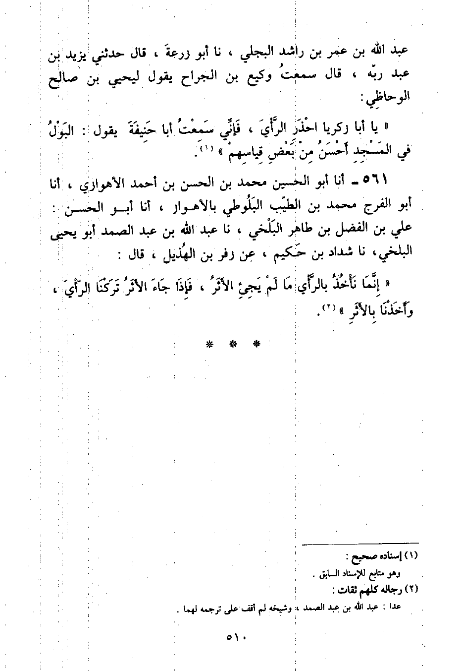 أنا أَبُو الْحُسَيْنِ , مُحَمَّدُ بْنُ الْحَسَنِ بْنِ أَحْمَدَ الْأَهْوَازِيُّ , أنا أَبُو الْفَرَجِ , مُحَمَّدُ بْنُ الطَّيِّبِ الْبَلُّوطِيُّ بِالْأَهْوَازِ , أنا أَبُو الْحَسَنِ , عَلِيُّ بْنُ الْفَضْلِ بْنِ طَاهِرٍ الْبَلْخِيُّ , نا عَبْدُ اللَّهِ بْنُ عَبْدِ الصَّمَدِ أَبُو يَحْيَى الْبَلْخِيُّ , نا شَدَّادُ بْنُ حَكِيمٍ , عَنْ زُفَرَ بْنِ الْهُذَيْلِ , قَالَ: «إِنَّمَا نَأْخُذُ بِالرَّأْيِ مَا لَمْ يَجِئِ الْأَثَرُ , فَإِذَا جَاءَ الْأَثَرُ تَرَكْنَا الرَّأْيَ , وَأَخَذْنَا بِالْأَثَرِ»