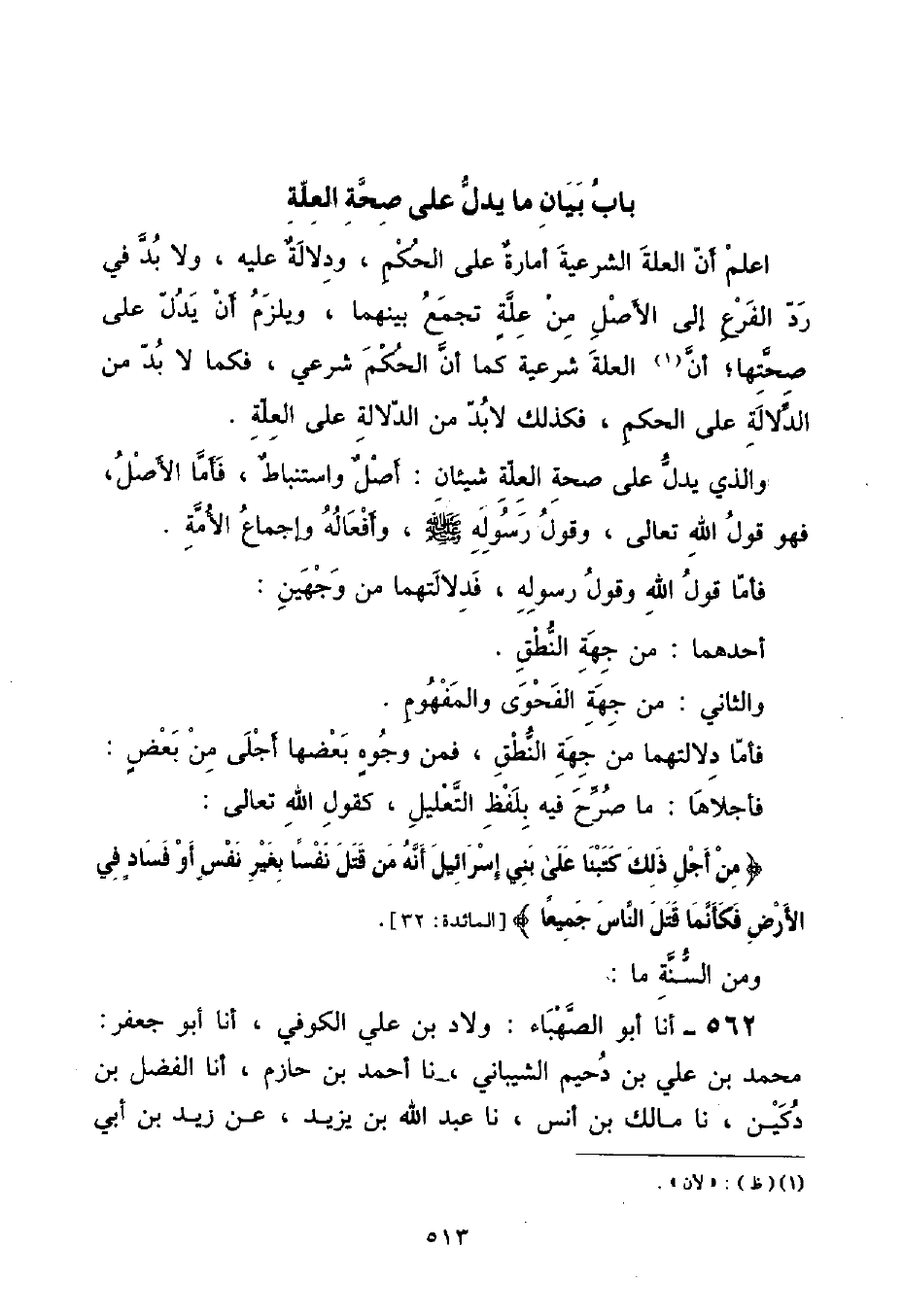 بَابُ بَيَانِ مَا يَدُلُّ عَلَى صِحَّةِ الْعِلَّةِ اعْلَمْ أَنَّ الْعِلَّةَ الشَّرْعِيَّةَ أَمَارَةٌ عَلَى الْحُكْمِ , وَدِلَالَةٌ عَلَيْهِ , وَلَا بُدَّ فِي رَدِّ الْفَرْعِ إِلَى الْأَصْلِ مِنْ عِلَّةٍ تَجْمَعُ بَيْنَهُمَا , وَيَلْزَمُ أَنْ يَدُلَّ عَلَى صِحَّتِهَا , أَنَّ الْعِلَّةَ شَرْعِيَّةٌ كَمَا أَنَّ الْحُكْمَ شَرْعِيُّ , فَكَمَا لَا بُدَّ مِنَ الدَّلَالَةِ عَلَى الْحُكْمِ , فَكَذَلِكَ لَا بُدَّ مِنَ الدَّلَالَةِ عَلَى الْعِلَّةِ وَالَّذِي يَدُلُّ عَلَى صِحَّةِ الْعِلَّةِ شَيْئَانِ: أَصْلٌ وَاسْتِنْبَاطٌ , فَأَمَّا الْأَصْلُ , فَهُوَ قَوْلُ اللَّهِ تَعَالَى , وَقَوْلُ رَسُولِهِ صَلَّى اللهُ عَلَيْهِ وَسَلَّمَ , وَأَفْعَالُهُ وَإِجْمَاعُ الْأُمَّةِ فَأَمَّا قَوْلُ اللَّهِ وَقَوْلُ رَسُولِهِ فَدَلَالَتُهُمَا مِنْ وَجْهَيْنِ: أَحَدُهُمَا: مِنْ جِهَةِ النُّطْقِ وَالثَّانِي: مِنْ جِهَةِ الْفَحْوَى وَالْمَفْهُومِ فَأَمَّا دَلَالَتُهُمَا مِنْ جِهَةِ النُّطْقِ , فَمِنْ وُجُوهٍ بَعْضُهَا أَجْلَى مِنْ بَعْضٍ: فَأَجْلَاهَا: مَا صُرِّحَ فِيهِ بِلَفْظِ التَّعْلِيلِ , كَقَوْلِ اللَّهِ تَعَالَى: {مِنْ أَجْلِ ذَلِكَ كَتَبْنَا عَلَى بَنِي إِسْرَائِيلَ أَنَّهُ مَنْ قَتَلَ نَفْسًا بِغَيْرِ نَفْسٍ أَوْ فَسَادٍ فِي الْأَرْضِ فَكَأَنَّمَا قَتَلَ النَّاسَ جَمِيعًا} [المائدة: ٣٢]