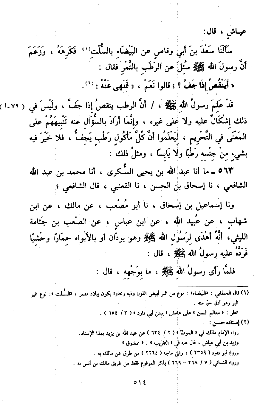 مَا أنا عَبْدُ اللَّهِ بْنُ يَحْيَى السُّكَّرِيُّ , أنا مُحَمَّدُ بْنُ عَبْدِ اللَّهِ الشَّافِعِيُّ , نا إِسْحَاقُ بْنُ الْحَسَنِ , نا الْقَعْنَبِيُّ , قَالَ الشَّافِعِيُّ: وَنَا إِسْمَاعِيلُ بْنُ إِسْحَاقَ , نا أَبُو مُصْعَبٍ , عَنْ مَالِكٍ , عَنِ ابْنِ شِهَابٍ , عَنْ عُبَيْدِ اللَّهِ , عَنِ ابْنِ عَبَّاسٍ , عَنِ الصَّعْبِ بْنِ جَثَّامَةَ اللَّيْثِيِّ , أَنَّهُ أَهْدَى لِرَسُولِ اللَّهِ صَلَّى اللهُ عَلَيْهِ وَسَلَّمَ وَهُوَ بِوَدَّانَ أَوْ بِالْأَبْوَاءِ حِمَارًا وَحْشِيًّا فَرَدَّهُ عَلَيْهِ رَسُولُ اللَّهِ صَلَّى اللهُ عَلَيْهِ وَسَلَّمَ قَالَ: فَلَمَّا رَأَى رَسُولُ اللَّهِ صَلَّى اللهُ عَلَيْهِ وَسَلَّمَ , مَا بِوَجْهِهِ قَالَ ⦗٥١٥⦘: «إِنَّا لَمْ نَرُدَّهُ عَلَيْكَ إِلَّا أَنَّا حُرُمٌ» بَيَّنَ النَّبِيُّ صَلَّى اللهُ عَلَيْهِ وَسَلَّمَ لِلصَّعْبِ بِهَذَا الْقَوْلِ الْمَعْنَى الَّذِي لِأَجْلِهِ رَدَّهُ لِيَعْلَمَ أَنَّ اصْطِيَادَ الْمُحْرِمِ وَمَا صِيدَ لَهُ وَأُهْدِيَ إِلَيْهِ بِمَنْزِلَةٍ وَاحِدَةٍ وَمِثْلُهُ