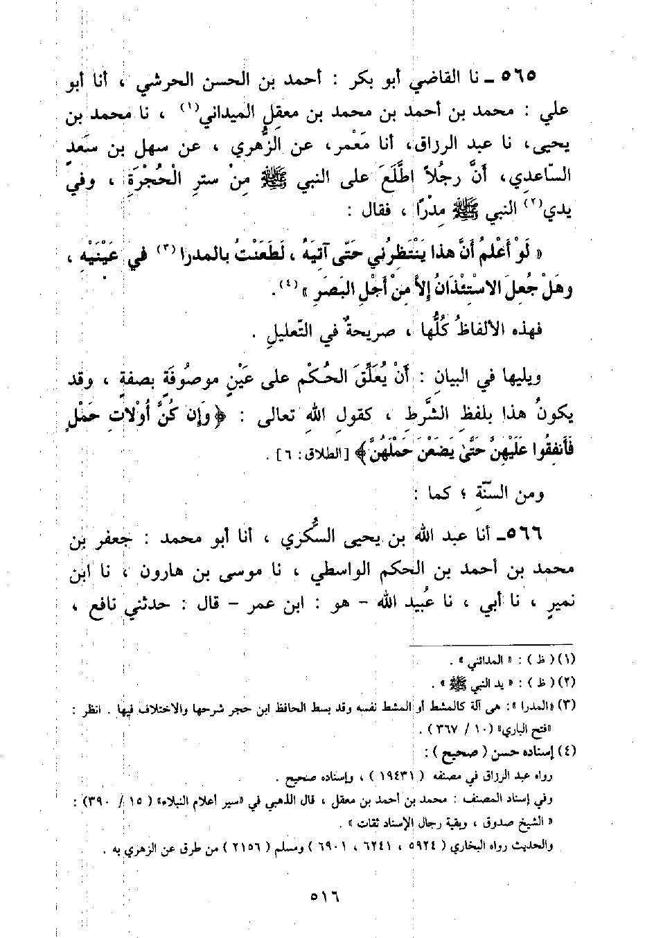 مَا: نا الْقَاضِي أَبُو بَكْرٍ أَحْمَدُ بْنُ الْحَسَنِ الْحَرَشِيُّ , أنا أَبُو عَلِيٍّ , مُحَمَّدُ بْنُ أَحْمَدَ بْنِ مُحَمَّدِ بْنِ مَعْقِلٍ الْمَيْدَانِيُّ , نا مُحَمَّدُ بْنُ يَحْيَى , نا عَبْدُ الرَّزَّاقِ , أنا مَعْمَرٌ , عَنِ الزُّهْرِيِّ , عَنْ سَهْلِ بْنِ سَعْدٍ السَّاعِدِيِّ , أَنَّ رَجُلًا , اطَّلَعَ عَلَى النَّبِيِّ صَلَّى اللهُ عَلَيْهِ وَسَلَّمَ مِنْ سِتْرِ الْحُجْرَةِ , وَفِي يَدَيِ النَّبِيِّ صَلَّى اللهُ عَلَيْهِ وَسَلَّمَ مِدْرًا , فَقَالَ: «لَوْ أَعْلَمُ أَنَّ هَذَا يَنْتَظِرُنِي حَتَّى آتِيَهُ , لَطَعَنْتُ بِالْمِدْرَا فِي عَيْنَيْهِ , وَهَلْ جُعِلَ الِاسْتِئْذَانُ إِلَّا مِنْ أَجْلِ الْبَصَرِ» فَهَذِهِ الْأَلْفَاظُ كُلُّهَا صَرِيحَةٌ فِي التَّعْلِيلِ وَيَلِيهَا فِي الْبَيَانِ: أَنْ يُعَلَّقَ الْحُكْمُ عَلَى عَيْنٍ مَوْصُوفَةٍ بِصِفَةٍ , وَقَدْ يَكُونُ هَذَا بِلَفْظِ الشَّرْطِ , كَقَوْلِ اللَّهِ تَعَالَى: {وَإِنْ كُنَّ أُولَاتِ حَمْلٍ فَأَنْفِقُوا عَلَيْهِنَّ حَتَّى يَضَعْنَ حَمْلَهُنَّ} [الطلاق: ٦]