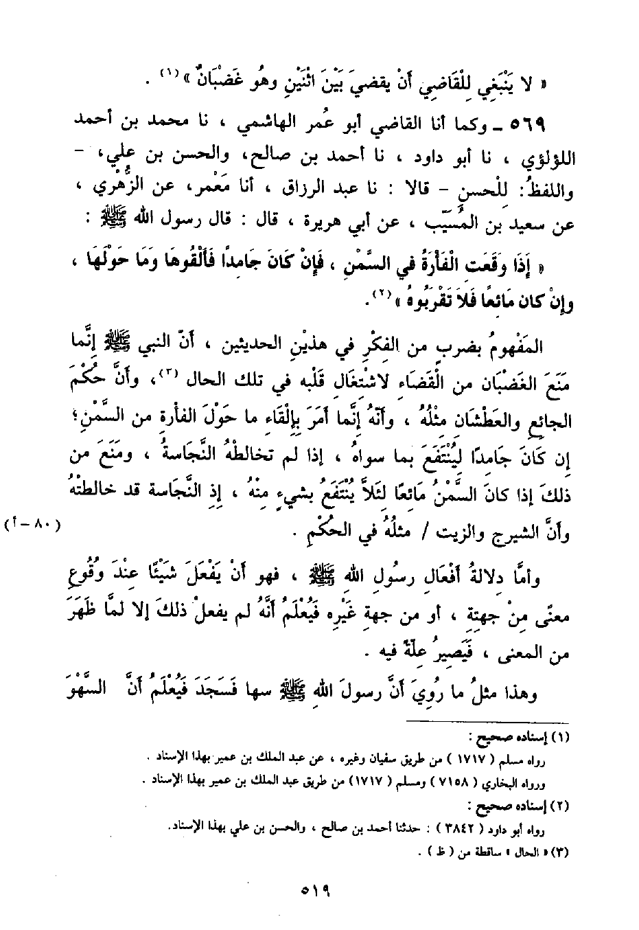 وَكَمَا أنا الْقَاضِي أَبُو عُمَرَ الْهَاشِمِيُّ , نا مُحَمَّدُ بْنُ أَحْمَدَ اللُّؤْلُؤِيُّ , نا أَبُو دَاوُدَ , نا أَحْمَدُ بْنُ صَالِحٍ , وَالْحَسَنُ بْنُ عَلِيٍّ وَاللَّفْظُ لِلْحَسَنِ - قَالَا: نا عَبْدُ الرَّزَّاقِ , أنا مَعْمَرٌ , عَنِ الزُّهْرِيِّ , عَنْ سَعِيدِ بْنِ الْمُسَيِّبِ , عَنْ أَبِي هُرَيْرَةَ , قَالَ: قَالَ رَسُولُ اللَّهِ صَلَّى اللهُ عَلَيْهِ وَسَلَّمَ: «إِذَا وَقَعَتِ الْفَأْرَةُ فِي السَّمْنِ , فَإِنْ كَانَ جَامِدًا فَأَلْقُوهَا وَمَا حَوْلَهَا , وَإِنْ كَانَ مَائِعًا فَلَا تُقَرِّبُوهُ» الْمَفْهُومُ بِضَرْبٍ مِنَ الْفِكْرِ فِي هَذَيْنِ الْحَدِيثَيْنِ أَنَّ النَّبِيِّ صَلَّى اللهُ عَلَيْهِ وَسَلَّمَ إِنَّمَا مَنَعَ الْغَضْبَانَ مِنَ الْقَضَاءِ لِاشْتِغَالِ قَلْبِهِ فِي تِلْكَ الْحَالِ , وَأَنَّ حُكْمَ الْجَائِعِ وَالْعَطْشَانِ مِثْلُهُ , وَأَنَّهُ إِنَّمَا أَمَرَ بِإِلْقَاءِ مَا حَوْلَ الْفَأْرَةِ مِنَ السَّمْنِ , إِنْ كَانَ جَامِدًا لِيُنْتَفَعَ بِمَا سِوَاهُ , إِذَا لَمْ تُخَالِطْهُ النَّجَاسَةُ , وَمَنَعَ مِنْ ذَلِكَ إِذَا كَانَ السَّمْنُ مَائِعًا لِئَلَّا يُنْتَفَعَ بِشَيْءٍ مِنْهُ , إِذِ النَّجَاسَةُ قَدْ خَالَطَتْهُ وَأَنَّ الشَّيْرَجَ وَالزَّيْتَ مِثْلُهُ فِي الْحُكْمِ وَأَمَّا دَلَالَةُ أَفْعَالِ رَسُولِ اللَّهِ صَلَّى اللهُ عَلَيْهِ وَسَلَّمَ , فَهُوَ أَنْ يَفْعَلَ شَيْئًا عِنْدَ وقُوعِ مَعْنًى مِنْ جِهَتِهِ , أَوْ مِنْ جِهَةٍ غَيْرِهِ فَيُعْلَمُ أَنَّهُ لَمْ يَفْعَلْ ذَلِكَ إِلَّا لِمَا ظَهَرَ مِنَ الْمَعْنَى , فَيَصِيرُ عِلَّةً فِيهِ وَهَذَا مِثْلُ مَا رُوِيَ أَنَّ رَسُولَ اللَّهِ صَلَّى اللهُ عَلَيْهِ وَسَلَّمَ سَهَا فَسَجَدَ فَيُعْلَمُ أَنَّ السَّهْوَ ⦗٥٢٠⦘ عِلَّةٌ لِلسُّجُودِ , وَأَنَّ أَعْرَابِيًّا جَامَعَ فِي نَهَارِ رَمَضَانَ فَأَوْجَبَ عَلَيْهِ عِتْقَ رَقَبَةٍ , فَيُعْلَمُ أَنَّ الْجِمَاعَ عِلَّةٌ لِإِيجَابِ الْكَفَّارَةِ وَأَمَّا دَلَالَةُ الْإِجْمَاعِ فَهُوَ أَنْ تُجْمِعَ الْأُمَّةُ عَلَى التَّعْلِيلِ بِهِ