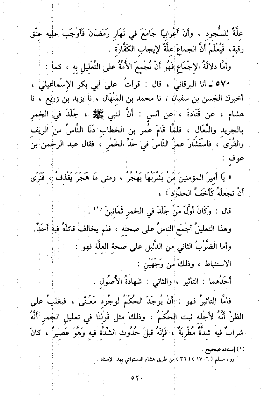 كَمَا: أنا الْبُرْقَانِيُّ , قَالَ: قَرَأْتُ عَلَى أَبِي بَكْرٍ الْإِسْمَاعِيلِيِّ: أَخْبَرَكَ الْحَسَنُ بْنُ سُفْيَانَ , نا مُحَمَّدُ بْنُ الْمِنْهَالِ , نا يَزِيدُ بْنُ زُرَيْعٍ , نا هِشَامٌ , عَنْ قَتَادَةَ , عَنْ أَنَسٍ: «أَنَّ النَّبِيَّ صَلَّى اللهُ عَلَيْهِ وَسَلَّمَ جَلَدَ فِي الْخَمْرِ بِالْجَرِيدِ وَالنِّعَالِ» , فَلَمَّا قَامَ عُمَرُ بْنُ الْخَطَّابِ دَنَا النَّاسُ مِنَ الرِّيفِ وَالْقُرَى , فَاسْتَشَارَ عُمَرُ النَّاسَ فِي حَدِّ الْخَمْرِ , فَقَالَ عَبْدُ الرَّحْمَنِ بْنُ عَوْفٍ: يَا أَمِيرَ الْمُؤْمِنِينَ مَنْ يَشْرَبْهَا يَهْجُرُ , وَمَتَى مَا هَجَرَ يَقْذِفْ , فَنَرَى أَنْ تَجْعَلَهُ كَأَخَفِّ الْحُدُودِ قَالَ: وَكَانَ أَوَّلُ مَنْ جَلَدَ فِي الْخَمْرِ ثَمَانِينَ وَهَذَا التَّعْلِيلُ أَجْمَعَ النَّاسُ عَلَى صِحَّتِهِ , فَلَمْ يُخَالِفْ قَائِلَهُ فِيهِ أَحَدٌ وَأَمَّا الضَّرْبُ الثَّانِي مِنَ الدَّلِيلِ عَلَى صِحَّةِ الْعِلَّةِ فَهُوَ: الِاسْتِنْبَاطُ , وَذَلِكَ مِنْ وَجْهَيْنِ: أَحَدُهُمَا: التَّأْثِيرُ , وَالثَّانِي: شَهَادَةُ الْأُصُولِ فَأَمَّا التَّأْثِيرُ فَهُوَ: أَنْ يُوجَدَ الْحُكْمُ لِوُجُودِ مَعْنًى , فَيَغْلُبُ عَلَى الظَّنِّ أَنَّهُ لِأَجْلِهِ ثَبَتَ الْحُكْمُ , وَذَلِكَ مِثْلُ قَوْلِنَا فِي تَعْلِيلِ الْخَمْرِ أَنَّهُ شَرَابٌ فِيهِ شِدَّةٌ مُطْرِبَةٌ , فَإِنَّهُ قَبْلَ حُدُوثِ الشِّدَّةِ فِيهِ وَهُوَ عَصِيرٌ , كَانَ ⦗٥٢١⦘ حَلَالًا , ثُمَّ حَدَثَتِ الشِّدَّةُ فِيهِ فَحَرُمَ , ثُمَّ زَادَتِ الشِّدَّةُ فَحَلَّ , فَعُلِمَ أَنَّ الشِّدَّةَ هِيَ الْعِلَّةُ فِي تَحْرِيمِهِ وَأَمَّا شَهَادَةُ الْأُصُولِ: فَتَخْتَصُّ بِقِيَاسِ الدَّلَالَةِ , مِثْلَ أَنْ يَقُولَ فِي أَنَّ الْقَهْقَهَةَ فِي الصَّلَاةِ لَا تَنْقُضُ الْوُضُوءَ: مَا لَا يَنْقُضُ الطُّهْرَ خَارِجَ الصَّلَاةِ , لَا يَنْقُضُهُ دَاخِلَ الصَّلَاةِ كَالْكَلَامِ , فَيَدُلُّ عَلَيْهَا بِأَنَّ الْأُصُولَ تَشْهَدُ بِالتَّسْوِيَةِ بَيْنَ دَاخِلِ الصَّلَاةِ وَخَارِجِهَا فِي هَذَا الْمَعْنَى , أَلَا تَرَى أَنَّ مَا نَقَضَ الْوُضُوءَ دَاخِلَ الصَّلَاةِ نَقَضَهُ خَارِجَهَا كَالْأَحْدَاثِ كُلِّهَا وَمَا لَا يَنْقُضُ الْوُضُوءَ خَارِجَ الصَّلَاةِ لَا يَنْقُضُهُ دَاخِلَهَا , فَيَجِبُ أَنْ تَكُونَ الْقَهْقَهَةُ مِثْلَهَا