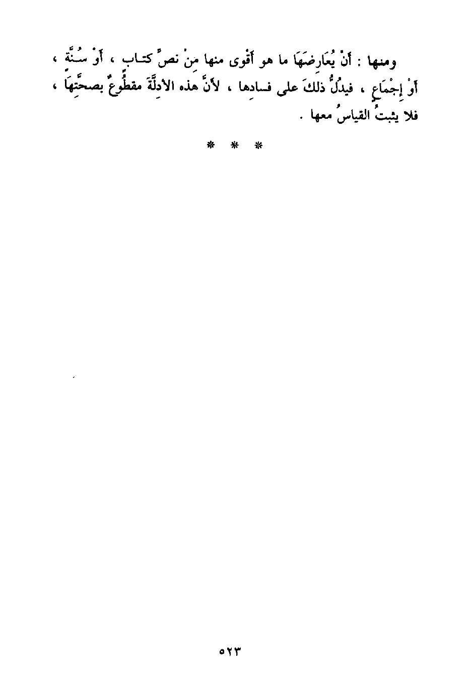 وَمِنْهَا: أَنْ يُعَارِضَهَا مَا هُوَ أَقْوَى مِنْهَا مِنْ نَصِّ كِتَابٍ , أَوْ سُنَّةٍ , أَوْ إِجْمَاعٍ , فَيَدُلُّ ذَلِكَ عَلَى فَسَادِهَا , لِأَنَّ هَذِهِ الْأَدِلَّةَ مَقْطُوعٌ بِصِحَّتِهَا , فَلَا يَثْبُتُ الْقِيَاسُ مَعَهَا