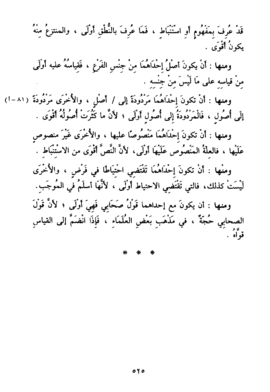 قَدْ عُرِفَ بِمَفْهُومٍ أَوِ اسْتِنْبَاطٍ , فَمَا عُرِفَ بِالنُّطْقِ أَوْلَى , وَالْمُنْتَزَعُ مِنْهُ يَكُونُ أَقْوَى وَمِنْهَا: أَنْ يَكُونَ أَصْلُ إِحْدَاهُمَا مِنْ جِنْسِ الْفَرْعِ , فَقِيَاسُهُ عَلَيْهِ أَوْلَى مِنْ قِيَاسِهِ عَلَى مَا لَيْسَ مِنْ جِنْسِهِ وَمِنْهَا: أَنْ تَكُونَ إِحْدَاهُمَا مَرْدُودَةً إِلَى أَصْلٍ , وَالْأُخْرَى مَرْدُودَةً إِلَى أُصُولٍ , فَالْمَرْدُودَةُ إِلَى أُصُولٍ أَوْلَى , لِأَنَّ مَا كَثُرَتْ أُصُولُهُ أَقْوَى وَمِنْهَا: أَنْ تَكُونَ إِحْدَاهُمَا مَنْصُوصًا عَلَيْهَا , وَالْأُخْرَى غَيْرُ مَنْصُوصٍ عَلَيْهَا , فَالْعِلَّةُ الْمَنْصُوصُ عَلَيْهَا أَوْلَى , لِأَنَّ النَّصَّ أَقْوَى مِنَ الِاسْتِنْبَاطِ وَمِنْهَا: أَنْ تَكُونَ إِحْدَاهُمَا تَقْتَضِي احْتِيَاطًا فِي فَرْضٍ , وَالْأُخْرَى لَيْسَتْ كَذَلِكَ , فَالَّتِي تَقْتَضِي الِاحْتِيَاطَ أَوْلَى , لِأَنَّهَا أَسْلَمُ فِي الْمُوجِبِ وَمِنْهَا: أَنْ يَكُونَ مَعَ إِحْدَاهُمَا قَوْلُ صَحَابِيٍّ فَهِيَ أَوْلَى , لِأَنَّ قَوْلَ الصَّحَابِيِّ حُجَّةٌ , فِي مَذْهَبِ بَعْضِ الْعُلَمَاءِ , فَإِذَا انْضَمَّ إِلَى الْقِيَاسِ قَوَّاهُ