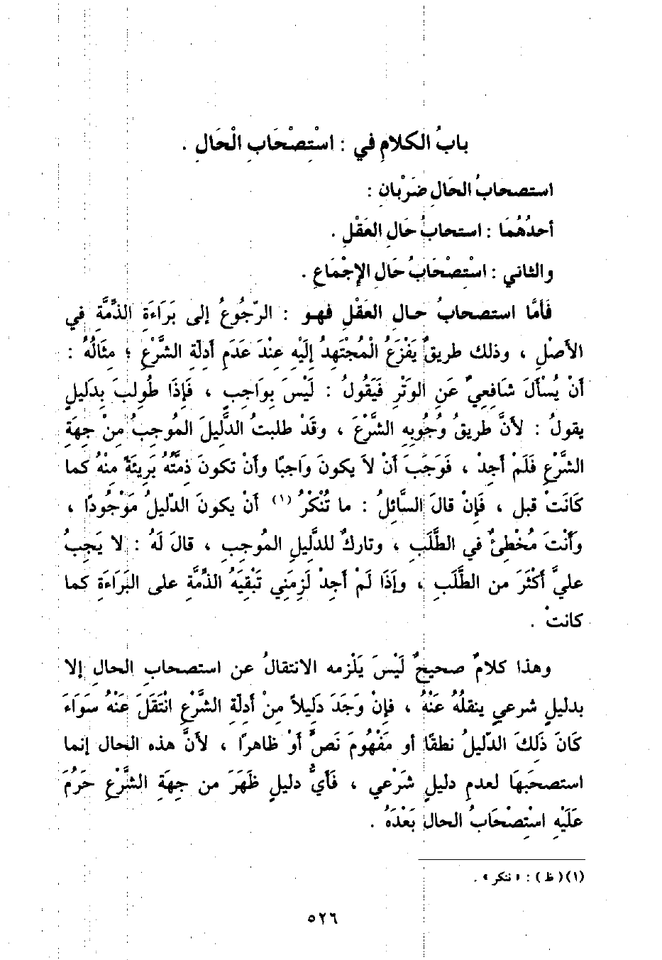 بَابُ الْكَلَامِ فِي: اسْتِصْحَابِ الْحَالِ اسْتِصْحَابُ الْحَالِ ضِرْبَانِ: أَحَدُهُمَا: اسْتِحْبَابُ حَالِ الْعَقْلِ وَالثَّانِي: اسْتِصْحَابُ حَالِ الْإِجْمَاعِ فَأَمَّا اسْتِصْحَابُ حَالِ الْعَقْلِ فَهُوَ: الرُّجُوعُ إِلَى بَرَاءَةِ الذِّمَّةِ فِي الْأَصْلِ , وَذَلِكَ طَرِيقٌ يَفْزَعُ الْمُجْتَهِدُ إِلَيْهِ عِنْدَ عَدَمِ أَدِلَّةِ الشَّرْعِ , مِثَالُهُ: أَنْ يُسْأَلَ شَافِعِيُّ عَنِ الْوِتْرِ فَيَقُولُ: لَيْسَ بِوَاجِبٍ , فَإِذَا طُولِبَ بِدَلِيلٍ يَقُولُ: لِأَنَّ طَرِيقَ وُجُوبِهِ الشَّرْعُ , وَقَدْ طَلَبْتُ الدَّلِيلَ الْمُوجِبَ مِنْ جِهَةِ الشَّرْعِ فَلَمْ أَجِدْ , فَوَجَبَ أَنْ لَا يَكُونَ وَاجِبًا وَأَنْ تَكُونَ ذِمَّتُهُ بَرِيئَةً مِنْهُ كَمَا كَانَتْ قَبْلُ , فَإِنْ قَالَ السَّائِلُ: مَا تُنْكِرُ أَنْ يَكُونَ الدَّلِيلُ مَوْجُودًا , وَأَنْتَ مُخْطِئٌ فِي الطَّلَبِ , وَتَارِكٌ لِلدَّلِيلِ الْمُوجِبِ قَالَ لَهُ: لَا يَجِبُ عَلَيَّ أَكْثَرُ مِنَ الطَّلَبِ , وَإِذَا لَمْ أَجِدْ لَزِمَنِي تَبْقِيَهُ الذِّمَّةِ عَلَى الْبَرَاءَةِ كَمَا كَانَتْ وَهَذَا كَلَامٌ صَحِيحٌ لَيْسَ يَلْزَمُهُ الِانْتِقَالُ عَنِ اسْتِصْحَابِ الْحَالِ إِلَّا بِدَلِيلٍ شَرْعِيٍّ يَنْقُلُهُ عَنْهُ , فَإِنْ وَجَدَ دَلِيلًا مِنْ أَدِلَّةِ الشَّرْعِ انْتَقَلَ عَنْهُ سَوَاءً كَانَ ذَلِكَ الدَّلِيلُ نُطْقًا أَوْ مَفْهُومَ نَصٍّ أَوْ ظَاهِرًا , لِأَنَّ هَذِهِ الْحَالَ إِنَّمَا اسْتَصْحَبَهَا لِعَدَمِ دَلِيلٍ شَرْعِيٍّ , فَأَيُّ دَلِيلٍ ظَهَرَ مِنْ جِهَةِ الشَّرْعِ حَرُمَ عَلَيْهِ اسْتِصْحَابُ الْحَالِ بَعْدَهُ