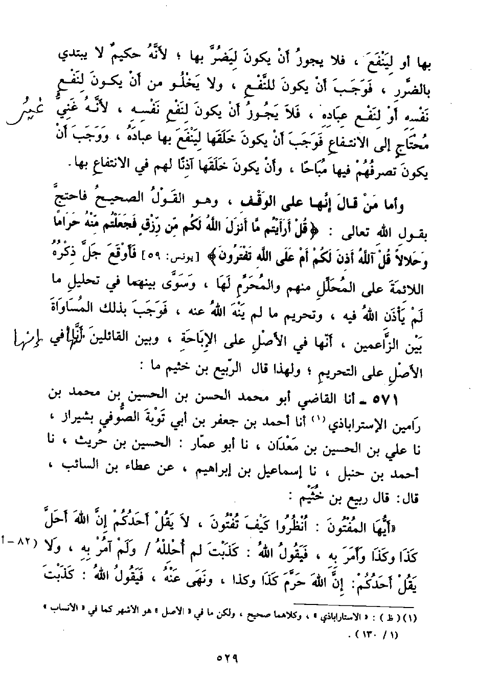 وَلِهَذَا قَالَ الرَّبِيعُ بْنُ خُثَيْمٍ مَا: أنا الْقَاضِي أَبُو مُحَمَّدٍ الْحَسَنُ بْنُ الْحُسَيْنِ بْنِ مُحَمَّدِ بْنِ رَامِينَ الْإِسْتَرَابَاذِيُّ , أنا أَحْمَدُ بْنُ جَعْفَرِ بْنِ أَبِي تَوْبَةَ الصُّوفِيُّ , بِشِيرَازَ , نا عَلِيُّ بْنُ الْحُسَيْنِ بْنِ مَعْدَانَ , نا أَبُو عَمَّارٍ الْحُسَيْنُ بْنُ حُرَيْثٍ , نا أَحْمَدُ بْنُ حَنْبَلٍ , نا إِسْمَاعِيلُ بْنُ إِبْرَاهِيمَ , عَنْ عَطَاءِ بْنِ السَّائِبِ , قَالَ: قَالَ رَبِيعُ بْنُ خُثَيْمٍ: " أَيُّهَا الْمُفْتُونَ: انْظُرُوا كَيْفَ تُفْتُونَ , لَا يَقُلْ أَحَدُكُمْ إِنَّ اللَّهَ أَحَلَّ كَذَا وَكَذَا وَأَمَرَ بِهِ , فَيَقُولُ اللَّهُ: كَذَبْتَ لَمْ أُحْلِلْهُ وَلَمْ آمُرْ بِهِ , وَلَا يَقُلْ أَحَدُكُمْ: إِنَّ اللَّهَ حَرَّمَ كَذَا وَكَذَا , وَنَهَى عَنْهُ , فَيَقُولُ اللَّهُ: كَذَبْتَ ⦗٥٣٠⦘ لَمْ أُحَرِّمْهُ وَلَمْ أَنْهَ عَنْهُ " قُلْتُ: وَلِأَنَّ الْمُبَاحَ مَا أَعْلَمَ صَاحِبُ الشَّرْعِ أَنَّهُ لَا ثَوَابَ فِي فِعْلِهِ , وَلَا عِقَابَ فِي تَرْكِهِ وَالْمَحْظُورُ: مَا أَعْلَمَ أَنَّ فِيَ فِعْلِهِ عِقَابًا , فَإِذَا لَمْ يَرِدِ الشَّرْعُ بِوَاحِدٍ مِنْهُمَا وَجَبَ أَنْ لَا يَكُونَ مَحْظُورًا وَلَا مُبَاحًا , وَيَكُونُ حُكْمُهُ مَوْقُوفًا عَلَى وُرُودِ الشَّرْعِ , فَيَحْكُمُ بِمَا يَرِدُ الشَّرْعُ فِيهِ فَأَمَّا الْجَوَابُ عَنْ قَوْلِ مَنْ حَظَرَهَا بِأَنَّهَا مِلْكٌ لِلَّهِ فَهُوَ: أَنَّهُ إِنْ أَرَادَ أَنَّهُ لَا يَجُوزُ التَّصَرُّفُ فِي مِلْكِ الْغِيَرِ إِلَّا بِإِذْنِهِ مِنْ طَرِيقِ الْعَقْلِ لَمْ يَسْلَمْ لَهُ ذَلِكَ , وَهَلْ وَقَعَتِ الْمُنَازَعَةُ إِلَّا فِيهِ , وَإِنْ أَرَادَ بِهِ مِنْ طَرِيقِ الشَّرْعِ , فَهُوَ صَحِيحٌ , وَلِهَذَا قُلْنَا إِنَّهُ مَوْقُوفٌ عَلَى مَجِيءِ الشَّرْعِ , وَأَمَّا أَمْلَاكُ الْآدَمَيِّينَ فَإِنَّمَا حَرُمَ التَّصَرُّفُ فِيهَا مِنْ غَيْرِ إِذْنِ مَالِكِهَا بِالشَّرْعِ دُونَ الْعَقْلِ , وَلَمْ يَكُنْ لَهُ فِيمَا ذَكَرَهُ حُجَّةٌ وَأَمَّا الْجَوَابُ عَمَّا احْتَجَّ بِهِ مَنْ أَبَاحَهَا فَهُوَ أَنَّهُ غَيْرُ صَحِيحٍ , لَأَنَّا لَا نُعَلِّلُ أَفْعَالَ اللَّهِ , وَعَلَى أَنَّ مَا ذَكَرُوهُ يَنْقَلِبُ عَلَيْهِمْ فِيمَا خَلَقَهُ اللَّهُ وَحَرَّمَهُ عَلَى عِبَادِهِ مِثْلِ الْخَمْرِ وَالْخِنْزِيرِ , وَيُقَسَّمُ عَلَيْهِمْ مِثْلَ تَقْسِيمِهِمْ حَرْفًا بِحَرْفٍ , مَعَ أَنَّا نَقُولُ يَجُوزُ أَنْ يَكُونَ اللَّهُ تَعَالَى خَلَقَهَا لِيَمْتَحِنَهُمْ بِالْكَفِّ عَنْهَا , وَيُثِيبَهُمْ عَلَى ذَلِكَ , أَوْ لِيَسْتَدِلُّوا بِهَا عَلَى خَالِقِهَا , وَهَذَا وَجْهٌ يُخْرِجُهُ مِنْ حَدِّ الْعَبَثِ فَسَقَطَ مَا قَالُوهُ ⦗٥٣١⦘ وَفَائِدَةُ هَذِهِ الْمَسْأَلَةِ أَنَّ مَنْ حَرَّمَ شَيْئًا أَوْ أَبَاحَهُ فَسُئِلَ عَنْ حُجَّتِهِ , فَقَالَ: طَلَبْتُ دَلِيلَ الشَّرْعِ فَلَمْ أَجِدْ فَبَقِيتُ عَلَى حُكْمِ الْعَقْلِ مِنْ تَحْرِيمٍ أَوْ إِبَاحَةٍ هَلْ يَصِحُّ ذَلِكَ أَوْ لَا؟ وَهَلْ يَلْزَمُ خَصْمَهُ احْتِجَاجُهُ بِهَذَا الْقَوْلِ أَوْ لَا؟ وَهَذَا مِمَّا يَحْتَاجُ الْفَقِيهُ إِلَى مَعْرِفَتِهِ وَالْوُقُوفِ عَلَى حَقِيقَتِهِ