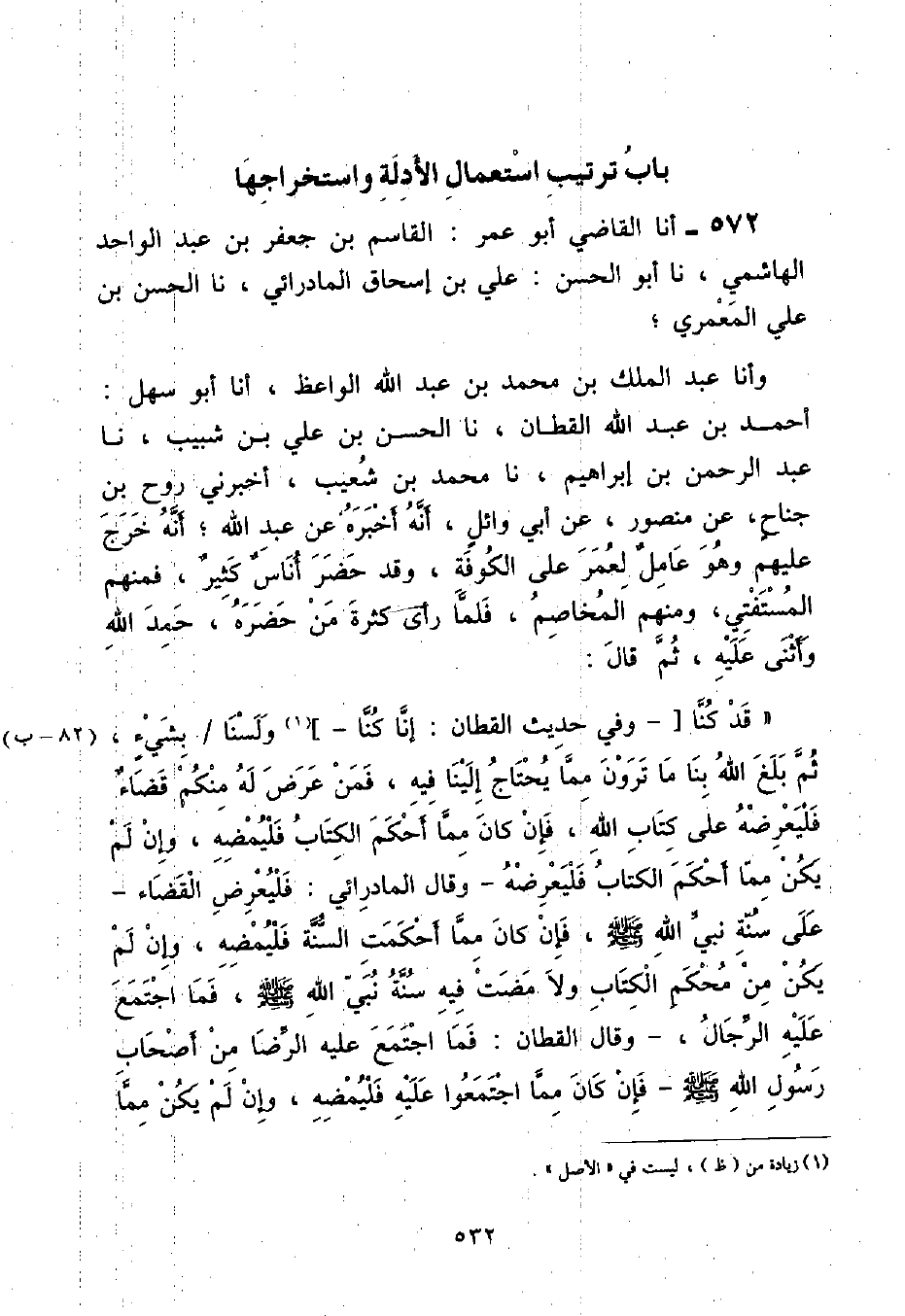 أنا الْقَاضِي أَبُو عُمَرَ الْقَاسِمُ بْنُ جَعْفَرِ بْنِ عَبْدِ الْوَاحِدِ الْهَاشِمِيُّ , نا أَبُو الْحَسَنِ , عَلِيُّ بْنُ إِسْحَاقَ الْمَادَرَائِيُّ , نا الْحَسَنُ بْنُ عَلِيٍّ الْمَعْمَرِيُّ , وَأَنَا عَبْدُ الْمَلِكِ بْنُ مُحَمَّدِ بْنِ عَبْدِ اللَّهِ الْوَاعِظُ , أنا أَبُو سَهْلٍ أَحْمَدُ بْنُ عَبْدِ اللَّهِ الْقَطَّانُ , نا الْحَسَنُ بْنُ عَلِيِّ بْنِ شَبِيبٍ , نا عَبْدُ الرَّحْمَنِ بْنُ إِبْرَاهِيمَ , نا مُحَمَّدُ بْنُ شُعَيْبٍ , أَخْبَرَنِي رَوْحُ بْنُ جُنَاحٍ , عَنْ مَنْصُورٍ , عَنْ أَبِي وَائِلٍ , أَنَّهُ أَخْبَرَهُ عَنْ عَبْدِ اللَّهِ , أَنَّهُ خَرَجَ عَلَيْهِمْ وَهُوَ عَامِلٌ لِعُمَرَ عَلَى الْكُوفَةِ , وَقَدْ حَضَرَ أُنَاسٌ كَثِيرٌ , فَمِنْهُمُ الْمُسْتَفْتِي , وَمِنْهُمُ الْمُخَاصِمُ , فَلَمَّا رَأَى كَثْرَةَ مَنْ حَضَرَهُ , حَمِدَ اللَّهَ وَأَثْنَى عَلَيْهِ , ثُمَّ قَالَ: «قَدْ كُنَّا» - وَفِي حَدِيثِ الْقَطَّانِ: إِنَّا كُنَّا - " وَلَسْنَا بِشَيْءٍ , ثُمَّ بَلَغَ اللَّهُ بِنَا مَا تَرَوْنَ مِمَّا يَحْتَاجُ إِلَيْنَا فِيهِ , فَمَنْ عَرَضَ لَهُ مِنْكُمْ قَضَاءٌ فَلْيَعْرِضْهُ عَلَى كِتَابِ اللَّهِ , فَإِنْ كَانَ مِمَّا أَحْكَمَ الْكِتَابُ فَلْيُمْضِهِ , وَإِنْ لَمْ يَكُنْ مِمَّا أَحْكَمَ الْكِتَابُ فَلْيَعْرِضْهُ، وَقَالَ المَادِرَائِيُّ: فَلْيَعْرِضَ القَضَاءَ عَلَى سُنَّةِ نَبِيِّ اللَّهِ صَلَّى اللهُ عَلَيْهِ وَسَلَّمَ، فَإِنْ كَانَ مِمَّا أَحْكَمَتِ السُّنَّةُ فَلْيَمْضِه، وَإِنْ لَمْ يَكُنْ مِنْ مُحْكَمِ الْكِتَابِ وَلَا مَضَتْ فِيهِ سُنَّةُ نَبِيِّ اللَّهِ صَلَّى اللهُ عَلَيْهِ وَسَلَّمَ , فَمَا اجْتَمَعَ عَلَيْهِ الرِّجَالُ " , - وَقَالَ الْقَطَّانُ: فَمَا اجْتَمَعَ عَلَيْهِ الرِّضَا مِنْ أَصْحَابِ رَسُولِ اللَّهِ صَلَّى اللهُ عَلَيْهِ وَسَلَّمَ - «فَإِنْ كَانَ مِمَّا اجْتَمَعُوا عَلَيْهِ فَلْيُمْضِهِ , وَإِنْ لَمْ يَكُنْ مِمَّا ⦗٥٣٣⦘ اجْتَمَعُوا عَلَيْهِ فَلْيَقُلْ بِرَأْيِهِ تَيَمُّمًا لِلْكِتَابِ وَالسُّنَّةِ , وَلَا يَقُولَنَّ أَحَدُكُمْ أَخَافُ وَلَا أَدْرِي , إِنَّ الْحَلَالَ بَيِّنٌ , وَالْحَرَامَ بَيِّنٌ , وَشُبُهَاتٌ بَيْنَ ذَلِكَ مَنْ تَوَقَّاهُنَّ كَانَ أَقَرَّ» - وَقَالَ الْقَطَّانُ: كَانَ أَوْفَرَ - «لِدِينِهِ وَعِرْضِهِ»