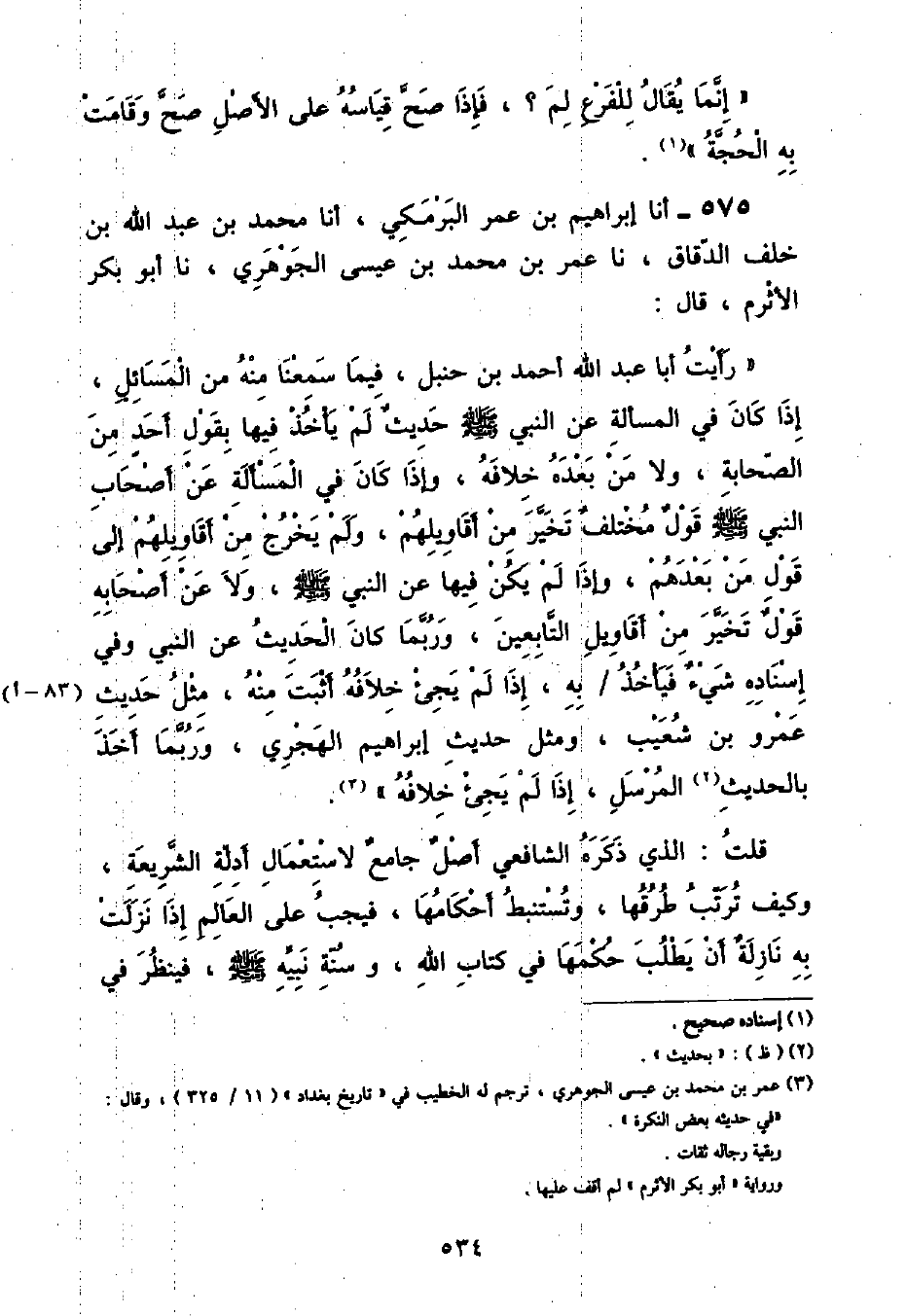 أنا إِبْرَاهِيمُ بْنُ عُمَرَ الْبَرْمَكِيُّ , أنا مُحَمَّدُ بْنُ عَبْدِ اللَّهِ بْنِ خَلَفٍ الدَّقَّاقُ , نا عُمَرُ بْنُ مُحَمَّدِ بْنِ عِيسَى الْجَوْهَرِيُّ , نا أَبُو بَكْرٍ الْأَثْرَمُ , قَالَ: رَأَيْتُ أَبَا عَبْدِ اللَّهِ أَحْمَدَ بْنَ حَنْبَلٍ , فِيمَا سَمِعْنَا مِنْهُ , مِنَ الْمَسَائِلِ , «إِذَا كَانَ فِي الْمَسْأَلَةِ عَنِ النَّبِيِّ صَلَّى اللهُ عَلَيْهِ وَسَلَّمَ حَدِيثٌ لَمْ يَأْخُذْ فِيهَا بِقَوْلِ أَحَدٍ مِنَ الصَّحَابَةِ , وَلَا مَنْ بَعْدَهُ خِلَافَهُ , وَإِذَا كَانَ فِي الْمَسْأَلَةِ عَنْ أَصْحَابِ النَّبِيِّ صَلَّى اللهُ عَلَيْهِ وَسَلَّمَ قَوْلٌ مُخْتَلِفٌ تَخَيَّرَ مِنْ أَقَاوِيلِهِمْ , وَلَمْ يَخْرُجْ مِنْ أَقَاوِيلِهِمْ إِلَى قَوْلِ مَنْ بَعْدَهُمْ , وَإِذَا لَمْ يَكُنْ فِيهَا عَنِ النَّبِيِّ صَلَّى اللهُ عَلَيْهِ وَسَلَّمَ , وَلَا عَنْ أَصْحَابِهِ قَوْلٌ تَخَيَّرَ مِنْ أَقَاوِيلِ التَّابِعِينَ , وَرُبَّمَا كَانَ الْحَدِيثُ عَنِ النَّبِيِّ وَفِي إِسْنَادِهِ شَيْءٌ فَيَأْخُذُ بِهِ , إِذَا لَمْ يَجِئْ خِلَافُهُ أَثْبَتَ مِنْهُ , مِثْلُ حَدِيثِ عَمْرِو بْنِ شُعَيْبٍ , وَمَثَلُ حَدِيثِ إِبْرَاهِيمَ الْهَجَرِيِّ , وَرُبَّمَا أَخَذَ بِالْحَدِيثِ الْمُرْسَلِ , إِذَا لَمْ يَجِئْ خِلَافُهُ» قُلْتُ: الَّذِي ذَكَرَهُ الشَّافِعِيُّ أَصْلٌ جَامِعٌ لِاسْتِعْمَالِ أَدِلَّةِ الشَّرِيعَةِ , وَكَيْفَ تُرَتَّبُ طُرُقُهَا , وَتُسْتَنْبَطُ أَحْكَامُهَا , فَيَجِبُ عَلَى الْعَالِمِ إِذَا نَزَلَتْ بِهِ نَازِلَةٌ أَنْ يَطْلُبَ حُكْمَهَا فِي كِتَابِ اللَّهِ , وَسُنَّةِ نَبِيِّهِ صَلَّى اللهُ عَلَيْهِ وَسَلَّمَ , فَيَنْظُرَ فِي
