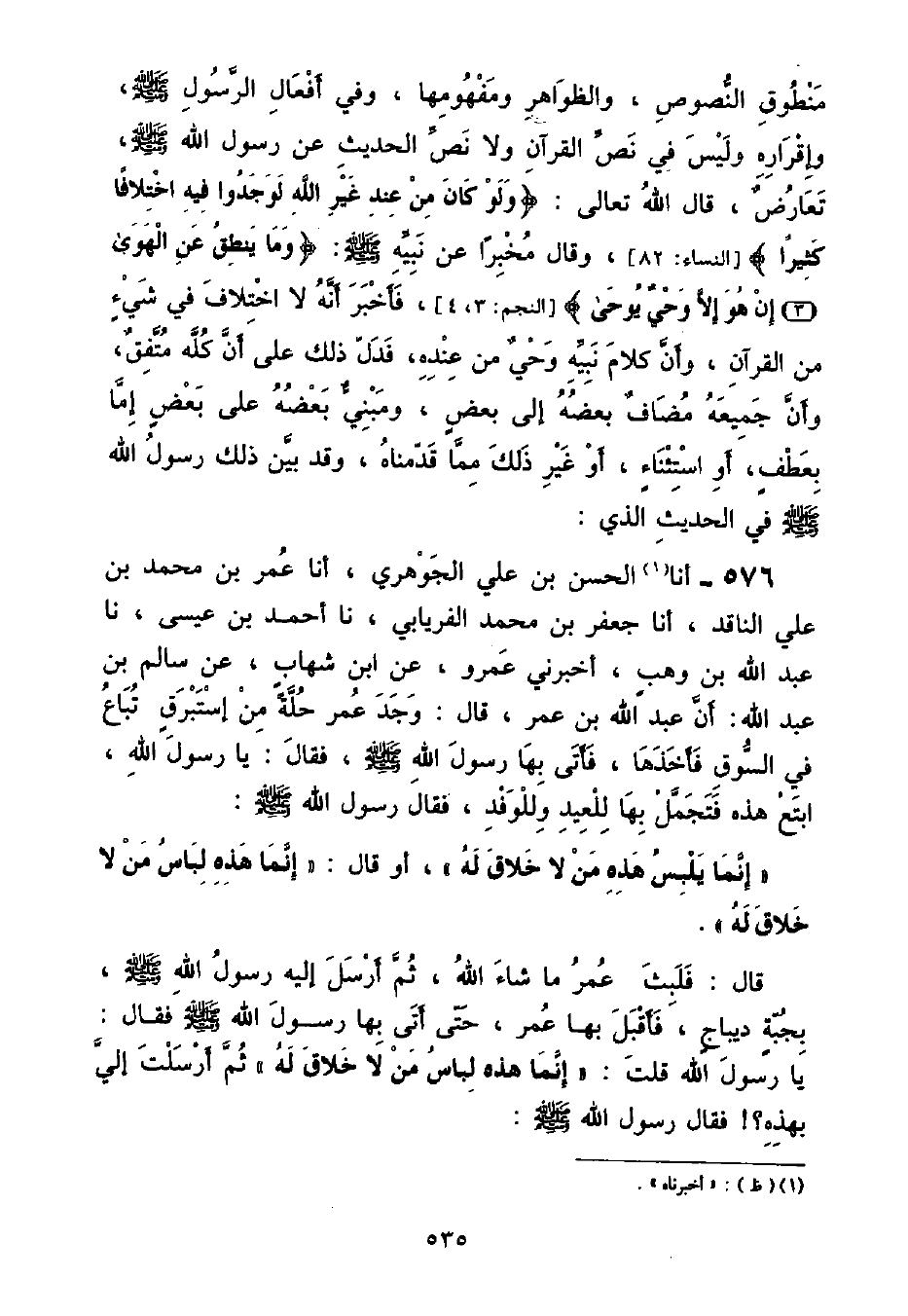 أنا الْحَسَنُ بْنُ عَلِيٍّ الْجَوْهَرِيُّ , أنا عُمَرُ بْنُ مُحَمَّدِ بْنِ عَلِيٍّ النَّاقِدُ , أنا جَعْفَرُ بْنُ مُحَمَّدٍ الْفِرْيَابِيُّ , نا أَحْمَدُ بْنُ عِيسَى , نا عَبْدُ اللَّهِ بْنُ وَهْبٍ , أَخْبَرَنِي عَمْرٌو , عَنِ ابْنِ شِهَابٍ , عَنْ سَالِمِ بْنِ عَبْدِ اللَّهِ: أَنَّ عَبْدَ اللَّهِ بْنَ عُمَرَ , قَالَ: وَجَدَ عُمَرُ حُلَّةً مِنْ إِسْتَبْرَقٍ تُبَاعُ فِي السُّوقِ فَأَخَذَهَا , فَأَتَى بِهَا رَسُولَ اللَّهِ صَلَّى اللهُ عَلَيْهِ وَسَلَّمَ , فَقَالَ يَا رَسُولَ اللَّهِ , ابْتَعْ هَذِهِ فَتَجَمَّلْ بِهَا لِلْعِيدِ وَلِلْوَفْدِ , فَقَالَ رَسُولُ اللَّهِ صَلَّى اللهُ عَلَيْهِ وَسَلَّمَ: «إِنَّمَا يَلْبَسُ هَذِهِ مَنْ لَا خَلَاقَ لَهُ» , أَوْ قَالَ: «إِنَّمَا هَذِهِ لِبَاسُ مَنْ لَا خَلَاقَ لَهُ» قَالَ: فَلَبِثَ عُمَرُ مَا شَاءَ اللَّهُ , ثُمَّ أَرْسَلَ إِلَيْهِ رَسُولُ اللَّهِ صَلَّى اللهُ عَلَيْهِ وَسَلَّمَ , بِجُبَّةِ دِيبَاجٍ , فَأَقْبَلَ بِهَا عُمَرُ , حَتَّى أَتَى بِهَا رَسُولَ اللَّهِ صَلَّى اللهُ عَلَيْهِ وَسَلَّمَ فَقَالَ: يَا رَسُولَ اللَّهِ قُلْتُ: إِنَّمَا هَذِهِ لِبَاسُ مَنْ لَا خَلَاقَ لَهُ ثُمَّ أَرْسَلْتَ إِلَيَّ بِهَذِهِ؟ فَقَالَ رَسُولُ اللَّهِ صَلَّى اللهُ عَلَيْهِ وَسَلَّمَ ⦗٥٣٦⦘: «تَبِيعُهَا أَوْ تُصِيبُ بِهَا حَاجَتَكَ أَوْ نَحْوَ هَذَا» فَفِي هَذَا الْحَدِيثِ تَعْلِيمٌ لِاسْتِعْمَالِ السُّنَنِ , وَالْأَخْذِ بِهَا كُلِّهَا لِأَنَّهُ عَلَيْهِ السَّلَامُ أَبَاحَ مِلْكَ الْحُلَّةِ مِنَ الْحَرِيرِ وَبَيْعَهَا وَهِبَتَهَا وَكُسْوَتَهَا لِلنِّسَاءِ , وَأَمَرَ عُمَرَ أَنْ يَسْتَثْنِيَ مِنْ ذَلِكَ اللِّبَاسَ الْمَذْكُورَ فِي حَدِيثِ النَّهْيِ فَقَطْ , وَلَا يَتَعَدَّاهُ إِلَى غَيْرِهِ
