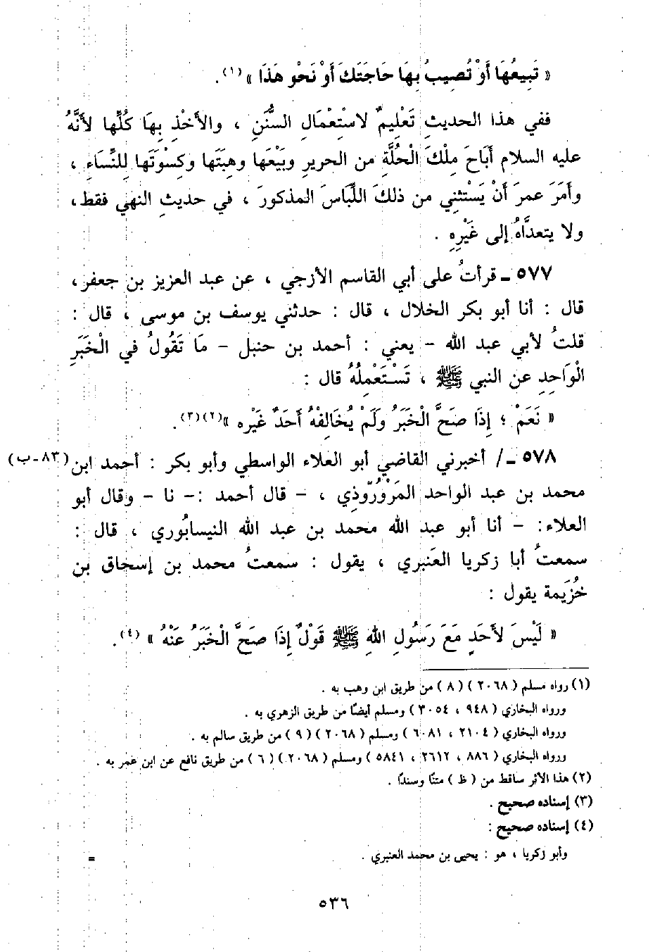قَرَأْتُ عَلَى أَبِي الْقَاسِمِ الْأَزْجِيِّ , عَنْ عَبْدِ الْعَزِيزِ بْنِ جَعْفَرٍ , قَالَ: أنا أَبُو بَكْرٍ الْخَلَّالُ , قَالَ: حَدَّثَنِي يُوسُفُ بْنُ مُوسَى , قَالَ: قُلْتُ لِأَبِي عَبْدِ اللَّهِ يَعْنِي أَحْمَدَ بْنَ حَنْبَلٍ مَا تَقُولُ فِي الْخَبَرِ الْوَاحِدِ عَنِ النَّبِيِّ صَلَّى اللهُ عَلَيْهِ وَسَلَّمَ , تَسْتَعْمِلُهُ قَالَ: «نَعَمْ , إِذَا صَحَّ الْخَبَرُ وَلَمْ يُخَالِفْهُ أَحَدٌ غَيْرُهُ»