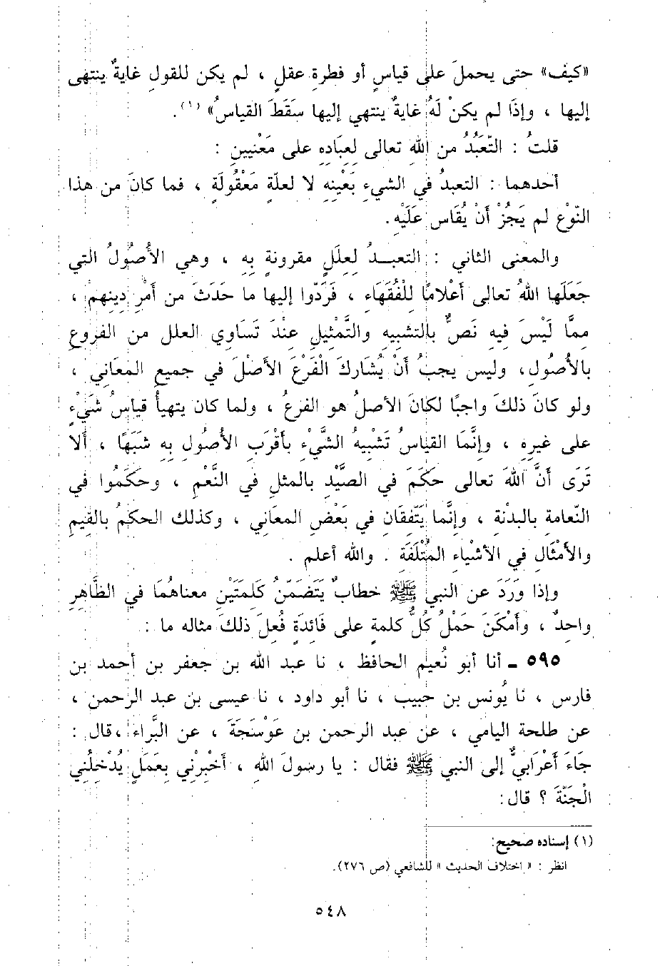 كَيْفَ حَتَّى يُحْمَلَ عَلَى قِيَاسٍ أَوْ فِطْرَةِ عَقْلٍ , لَمْ يَكُنْ لِلْقَوْلِ غَايَةٌ يَنْتَهِي إِلَيْهَا , وَإِذَا لَمْ يَكُنْ لَهُ غَايَةٌ يَنْتَهِي إِلَيْهَا سَقَطَ الْقِيَاسُ " قُلْتُ: التَّعَبُّدُ مِنَ اللَّهِ تَعَالَى لِعِبَادِهِ عَلَى مَعْنَيَيْنِ: أَحَدُهُمَا: التَّعَبُّدُ فِي الشَّيْءِ بِعَيْنِهِ لَا لِعِلَّةٍ مَعْقُولَةٍ , فَمَا كَانَ مِنْ هَذَا النَّوْعِ لَمْ يَجُزْ أَنْ يُقَاسَ عَلَيْهِ وَالْمَعْنَى الثَّانِي: التَّعَبُّدُ لِعِلَلٍ مَقْرُونَةٍ بِهِ , وَهِيَ الْأُصُولُ الَّتِي جَعَلَهَا اللَّهُ تَعَالَى أَعْلَامًا لِلْفُقَهَاءِ , فَرَدُّوا إِلَيْهَا مَا حَدَثَ مِنْ أَمْرِ دِينِهِمْ , مِمَّا لَيْسَ فِيهِ نَصٌّ بِالتَّشْبِيهِ وَالتَّمْثِيلِ عِنْدَ تُسَاوِي الْعِلَلِ مِنَ الْفُرُوعِ بِالْأُصُولِ , وَلَيْسَ يَجِبُ أَنْ يُشَارِكَ الْفَرْعُ الْأَصْلَ فِي جَمِيعِ الْمَعَانِي , وَلَوْ كَانَ ذَلِكَ وَاجِبًا لَكَانَ الْأَصْلُ هُوَ الْفَرْعُ , وَلَمَّا كَانَ يَتَهَيَّأُ قِيَاسُ شَيْءٍ عَلَى غَيْرِهِ , وَإِنَّمَا الْقِيَاسُ تَشْبِيهُ الشَّيْءِ بِأَقْرَبَ الْأُصُولِ بِهِ شَبَهًا , أَلَا تَرَى أَنَّ اللَّهَ تَعَالَى حَكَمَ فِي الصَّيْدِ بِالْمِثْلِ فِي النَّعْمِ , وَحَكَمُوا فِي النَّعَامَةِ بِالْبَدَنَةِ , وَإِنَّمَا يَتَّفِقَانِ فِي بَعْضِ الْمَعَانِي , وَكَذَلِكَ الْحُكْمُ بِالْقِيَمِ وَالْأَمْثَالِ فِي الْأَشْيَاءِ الْمُتْلَفَةِ وَاللَّهُ أَعْلَمُ وَإِذَا وَرَدَ عَنِ النَّبِيِّ صَلَّى اللهُ عَلَيْهِ وَسَلَّمَ خِطَابٌ يَتَضَمَّنُ كَلِمَتَيْنِ مَعْنَاهُمَا فِي الظَّاهِرِ وَاحِدٌ , وَأَمْكَنَ حَمْلُ كُلِّ كَلِمَةٍ عَلَى فَائِدَةٍ فُعِلَ ذَلِكَ مِثَالُهُ مَا: