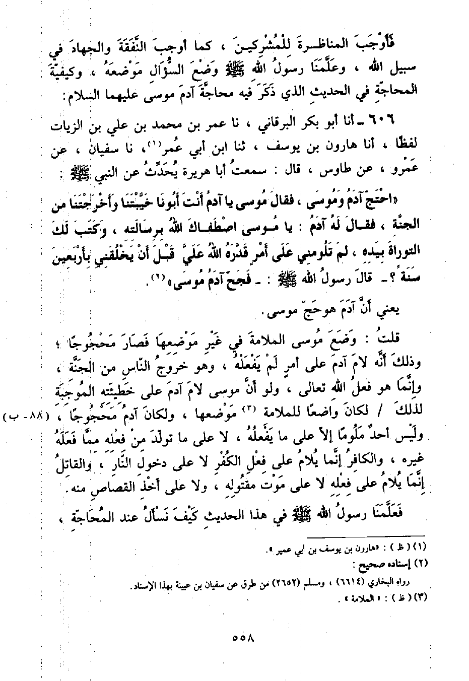 أنا أَبُو بَكْرٍ الْبُرْقَانِيُّ , نا عُمَرُ بْنُ مُحَمَّدِ بْنِ عَلِيِّ بْنِ الزَّيَّاتِ , لَفْظًا , أنا هَارُونُ بْنُ يُوسُفَ , ثنا ابْنُ أَبِي عُمَرَ , نا سُفْيَانُ , عَنْ عَمْرٍو , عَنْ طَاوُسٍ , قَالَ: سَمِعْتُ أَبَا هُرَيْرَةَ , يُحَدِّثُ عَنِ النَّبِيِّ صَلَّى اللهُ عَلَيْهِ وَسَلَّمَ: " احْتَجَّ آدَمُ وَمُوسَى , فَقَالَ مُوسَى يَا آدَمُ أَنْتَ أَبُونَا خَيَّبْتَنَا وَأَخْرَجْتَنَا مِنَ الْجَنَّةِ , فَقَالَ لَهُ آدَمُ: يَا مُوسَى اصْطَفَاكَ اللَّهُ بِرِسَالَتِهِ , وَكَتَبَ لَكَ التَّوْرَاةَ بِيَدِهِ , لِمَ تَلُومُنِي عَلَى أَمْرٍ قَدَّرَهُ اللَّهُ عَلَيَّ قَبْلَ أَنْ يَخْلُقَنِيَ بِأَرْبَعِينَ سَنَةً؟ " - قَالَ رَسُولُ اللَّهِ صَلَّى اللهُ عَلَيْهِ وَسَلَّمَ: - «فَجَحَّ آدَمُ مُوسَى يَعْنِي أَنَّ آدَمُ هُوَ حَجُّ مُوسَى» قُلْتُ: وَضَعَ مُوسَى الْمَلَامَةَ فِي غَيْرِ مَوْضِعِهَا فَصَارَ مَحْجُوجًا , وَذَلِكَ أَنَّهُ لَامَ آدَمُ عَلَى أَمْرٍ لَمْ يَفْعَلْهُ , وَهُوَ خُرُوجُ النَّاسِ مِنَ الْجَنَّةِ , وَإِنَّمَا هُوَ فِعْلُ اللَّهِ تَعَالَى , وَلَوْ أَنَّ مُوسَى لَامَ آدَمُ عَلَى خَطِيئَتِهِ الْمُوجِبَةِ لِذَلِكَ لَكَانَ وَاضِعًا لِلْمَلَامَةِ مَوْضِعَهَا , وَلَكَانَ آدَمُ مَحْجُوجًا وَلَيْسَ أَحَدٌ مَلُومًا إِلَّا عَلَى مَا يَفْعَلُهُ , لَا عَلَى مَا تُوَلَّدَ مِنْ فِعْلِهِ مِمَّا فَعَلَهُ غَيْرُهُ , وَالْكَافِرُ إِنَّمَا يُلَامُ عَلَى فِعْلِ الْكُفْرِ لَا عَلَى دُخُولِ النَّارِ , وَالقَاتِلُ إِنَّمَا يُلَامُ عَلَى فِعْلِهِ لَا عَلَى مَوْتِ مَقْتُولِهِ , وَلَا عَلَى أَخْذِ الْقِصَاصِ مِنْهُ فَعَلَّمَنَا رَسُولُ اللَّهِ صَلَّى اللهُ عَلَيْهِ وَسَلَّمَ فِي هَذَا الْحَدِيثِ كَيْفَ نَسْأَلُ عِنْدَ الْمُحَاجَّةِ , ⦗٥٥٩⦘ وَبَيَّنَ لَنَا أَنَّ الْمُحَاجَّةَ جَائِزَةٌ , وَأَنَّ مَنْ أَخْطَأَ مَوْضِعَ السُّؤَالِ كَانَ مَحْجُوجًا , وَظَهَرَ بِذَلِكَ قَوْلُ اللَّهِ تَعَالَى: {كَمَا أَرْسَلْنَا فِيكُمْ رَسُولًا مِنْكُمْ يَتْلُو عَلَيْكُمْ آيَاتِنَا وَيُزَكِّيكُمْ وَيُعَلِّمُكُمُ الْكِتَابَ وَالْحِكْمَةَ وَيُعَلِّمُكُمْ مَا لَمْ تَكُونُوا تَعْلَمُونَ} [البقرة: ١٥١] وَلَيْسَ هَذَا الْحَدِيثُ الَّذِي ذَكَرْنَاهُ مِنْ بَابِ إِثْبَاتِ الْقَدَرِ فِي شَيْءٍ , وَإِنَّمَا هُوَ وَارِدٌ فِيمَا وَصَفْنَاهُ مِنْ مُحَاجَّةِ آدَمُ وَمُوسَى , وَإِثْبَاتِ الْقَدَرِ إِنَّمَا صَحَّ فِي آيَاتٍ وَأَحَادِيثَ أُخَرَ