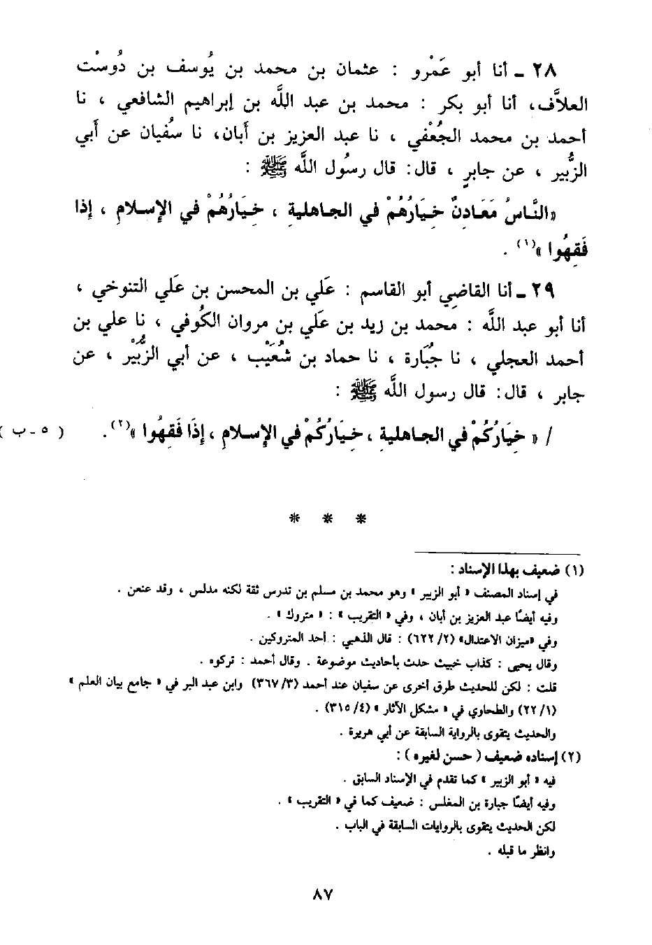 أنا أَبُو عَمْرٍو عُثْمَانُ بْنُ مُحَمَّدِ بْنِ يُوسُفَ بْنِ دَوَسْتٍ الْعَلَّافُ , أنا أَبُو بَكْرٍ مُحَمَّدُ بْنُ عَبْدِ اللَّهِ بْنِ إِبْرَاهِيمَ الشَّافِعِيُّ , نا أَحْمَدُ بْنُ مُحَمَّدٍ الْجُعْفِيُّ , نا عَبْدُ الْعَزِيزِ بْنُ أَبَانَ , نا سُفْيَانُ , عَنْ أَبِي الزُّبَيْرِ , عَنْ جَابِرٍ , قَالَ: قَالَ رَسُولُ اللَّهِ صَلَّى اللهُ عَلَيْهِ وَسَلَّمَ: «النَّاسُ مَعَادِنُ خِيَارُهُمْ فِي الْجَاهِلِيَّةِ خِيَارُهُمْ فِي الْإِسْلَامِ إِذَا فَقِهُوا»