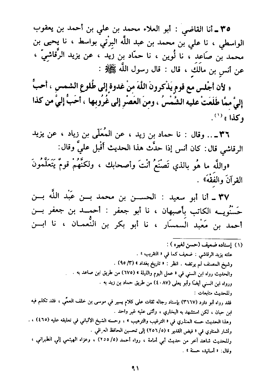أنا الْقَاضِي أَبُو الْعَلَاءِ مُحَمَّدُ بْنُ عَلِيِّ بْنِ أَحْمَدَ بْنِ يَعْقُوبَ الْوَاسِطِيُّ , نا عَلِيُّ بْنُ مُحَمَّدِ بْنِ عَبْدِ اللَّهِ الْبِرْتِيُّ , بِوَاسِطَ , نا يَحْيَى بْنُ مُحَمَّدِ بْنِ صَاعِدٍ , نا لُوَيْنٌ , نا حَمَّادُ بْنُ زَيْدٍ , عَنْ يَزِيدَ الرَّقَاشِيِّ , عَنْ أَنَسِ بْنِ مَالِكٍ , قَالَ: قَالَ رَسُولُ اللَّهِ صَلَّى اللهُ عَلَيْهِ وَسَلَّمَ: «لَأَنْ أَجْلِسَ مَعَ قَوْمٍ يَذْكُرُونَ اللَّهَ مِنْ غُدْوَةٍ إِلَى طُلُوعِ الشَّمْسِ , أَحَبُّ إِلَيَّ مِمَّا طَلَعَتْ عَلَيْهِ الشَّمْسُ , وَمِنَ الْعَصْرِ إِلَى غُرُوبِهَا أَحَبُّ إِلَيَّ مِنْ كَذَا وَكَذَا» وَقَالَ: نا حَمَّادُ بْنُ زَيْدٍ , عَنِ الْمُعَلَّى بْنِ زِيَادٍ , عَنْ يَزِيدَ الرَّقَاشِيِّ , قَالَ: كَانَ أَنَسٌ إِذَا حَدَّثَ هَذَا الْحَدِيث , أَقْبَلَ عَلَيَّ وَقَالَ: «وَاللَّهِ مَا هُوَ بِالَّذِي تَصْنَعُ أَنْتَ وَأَصْحَابُكَ , وَلَكِنَّهُمْ قَوْمٌ يَتَعَلَّمُونَ الْقُرْآنَ وَالْفِقْهَ»