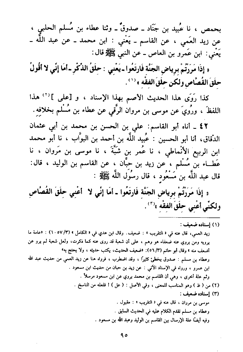 أَنَاهُ أَبُو الْقَاسِمِ عَلِيُّ بْنُ الْحَسَنِ بْنِ مُحَمَّدِ بْنِ أَبِي عُثْمَانَ الدَّقَّاقُ , أنا أَبُو الْحُسَيْنِ عُبَيْدُ اللَّهِ بْنُ أَحْمَدَ بْنِ الْبَوَّابِ , نا أَبُو مُحَمَّدٍ بْنُ الرَّبِيعِ الْأَنْمَاطِيُّ , نا عُمَرُ بْنُ شَبَّةَ , نا مُوسَى بْنُ مَرْوَانَ , نا عَطَاءُ بْنُ مُسْلِمٍ , عَنْ زَيْدِ بْنِ حِبَّانَ , عَنِ الْقَاسِمِ بْنِ الْوَلِيدِ , قَالَ: قَالَ عَبْدُ اللَّهِ بْنُ مَسْعُودٍ قَالَ رَسُولُ اللَّهِ صَلَّى اللهُ عَلَيْهِ وَسَلَّمَ: «إِذَا مَرَرْتُمْ بِرِيَاضِ الْجَنَّةِ فَارْتَعُوا - أَمَا إِنِّي لَا أَعِنِّي حِلَقَ الْقُصَّاصِ وَلَكِنِّي أَعْنِي حِلَقَ الْفِقْهِ»