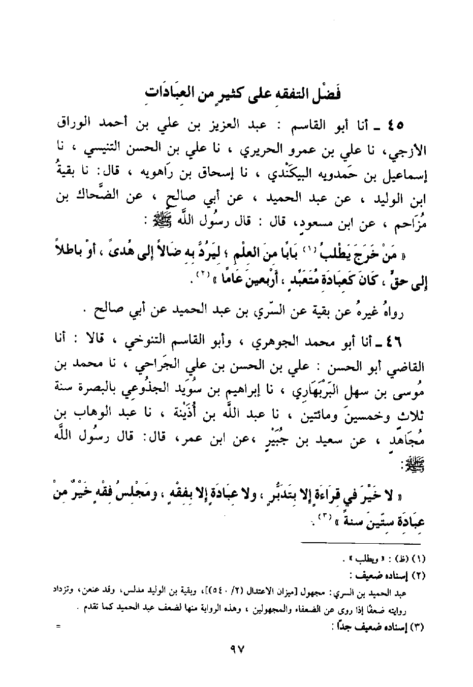 أنا أَبُو مُحَمَّدٍ الْجَوْهَرِيُّ , وَأَبُو الْقَاسِمِ التَّنُوخِيُّ , قَالَا: أنا الْقَاضِي أَبُو الْحَسَنِ عَلِيُّ بْنُ الْحَسَنِ بْنِ عَلِيٍّ الْجِرَاحِيُّ , نا مُحَمَّدُ بْنُ مُوسَى بْنِ سَهْلٍ الْبَرْبَهَارِيُّ , نا إِبْرَاهِيمُ بْنُ سُوَيْدٍ الْجُذُوعِيُّ , بِالْبَصْرَةَ سَنَةَ ثَلَاثٍ وَخَمْسِينَ وَمِائَتَيْنِ , نا عَبْدُ اللَّهِ بْنُ أُذَيْنَةَ , نا عَبْدُ الْوَهَّابِ بْنُ مُجَاهِدٍ , عَنْ سَعِيدِ بْنِ جُبَيْرٍ , عَنِ ابْنِ عُمَرَ قَالَ: قَالَ رَسُولُ اللَّهِ صَلَّى اللهُ عَلَيْهِ وَسَلَّمَ: «لَا خَيْرَ فِي قِرَاءَةٍ إِلَّا بِتَدَبُّرٍ , وَلَا عِبَادَةٍ إِلَّا بِفِقْهٍ , وَمَجْلِسُ فِقْهٍ خَيْرٌ مِنْ عِبَادَةِ سِتِّينَ سَنَةً»