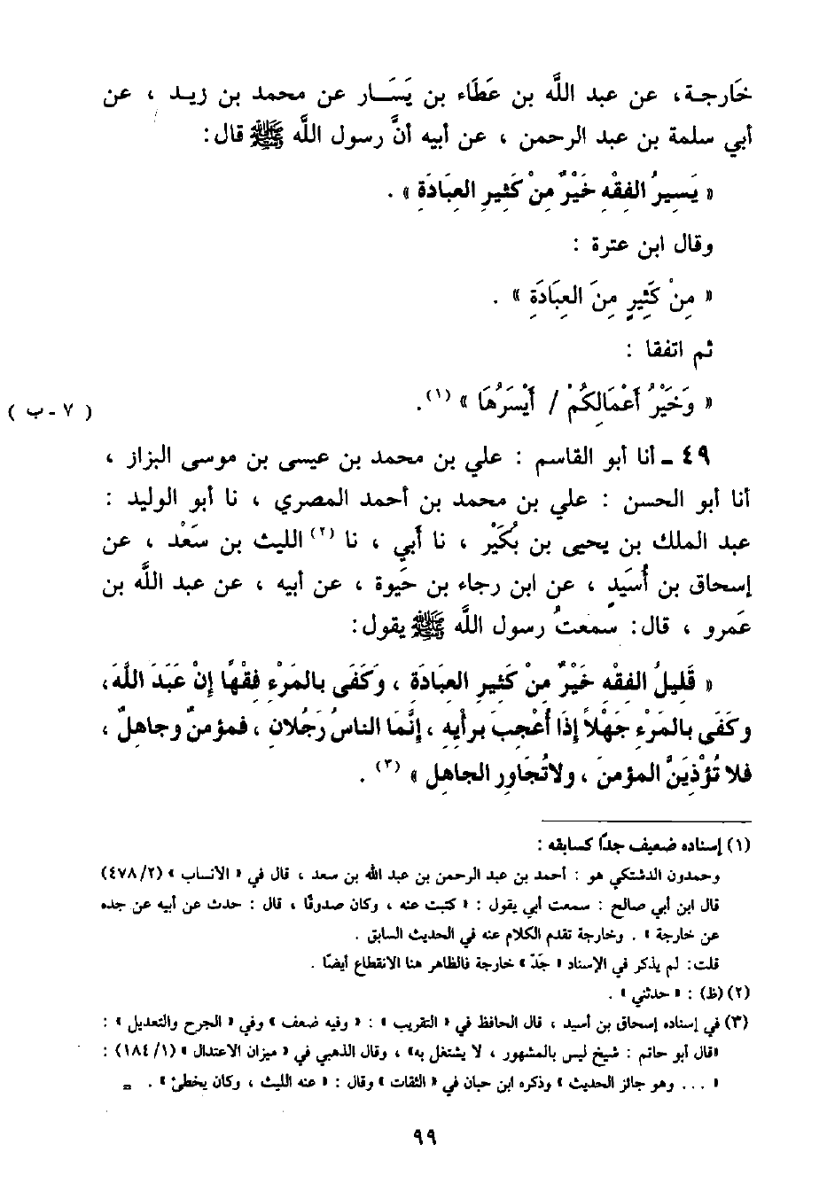 أنا أَبُو الْقَاسِمِ عَلِيُّ بْنُ مُحَمَّدِ بْنِ عِيسَى بْنِ مُوسَى الْبَزَّازُ , أنا أَبُو الْحَسَنِ عَلِيُّ بْنُ مُحَمَّدِ بْنِ أَحْمَدَ الْمِصْرِيُّ , نا أَبُو الْوَلِيدِ عَبْدُ الْمَلِكِ بْنُ يَحْيَى بْنِ بُكَيْرٍ , نا أَبِي , نا اللَّيْثُ بْنُ سَعْدٍ , عَنْ إِسْحَاقَ بْنِ أَسِيدٍ , عَنِ ابْنِ رَجَاءِ بْنِ حَيْوَةَ , عَنْ أَبِيهِ , عَنْ عَبْدِ اللَّهِ بْنِ عَمْرٍو , قَالَ: سَمِعْتُ رَسُولَ اللَّهِ صَلَّى اللهُ عَلَيْهِ وَسَلَّمَ يَقُولُ: «قَلِيلُ الْفِقْهِ خَيْرٌ مِنْ كَثِيرِ الْعِبَادَةِ , وَكَفَى بِالْمَرْءِ فِقْهًا إِنْ عَبَدَ اللَّهَ وَكَفَى بِالْمَرْءِ جَهْلًا إِذَا أُعْجِبَ بِرَأْيِهِ , إِنَّمَا النَّاسُ رَجُلَانِ , فَمُؤْمِنٌ وَجَاهِلٌ , فَلَا تُؤْذِيَنَّ الْمُؤْمِنَ , وَلَا تُجَاوِرُ الْجَاهِلَ»