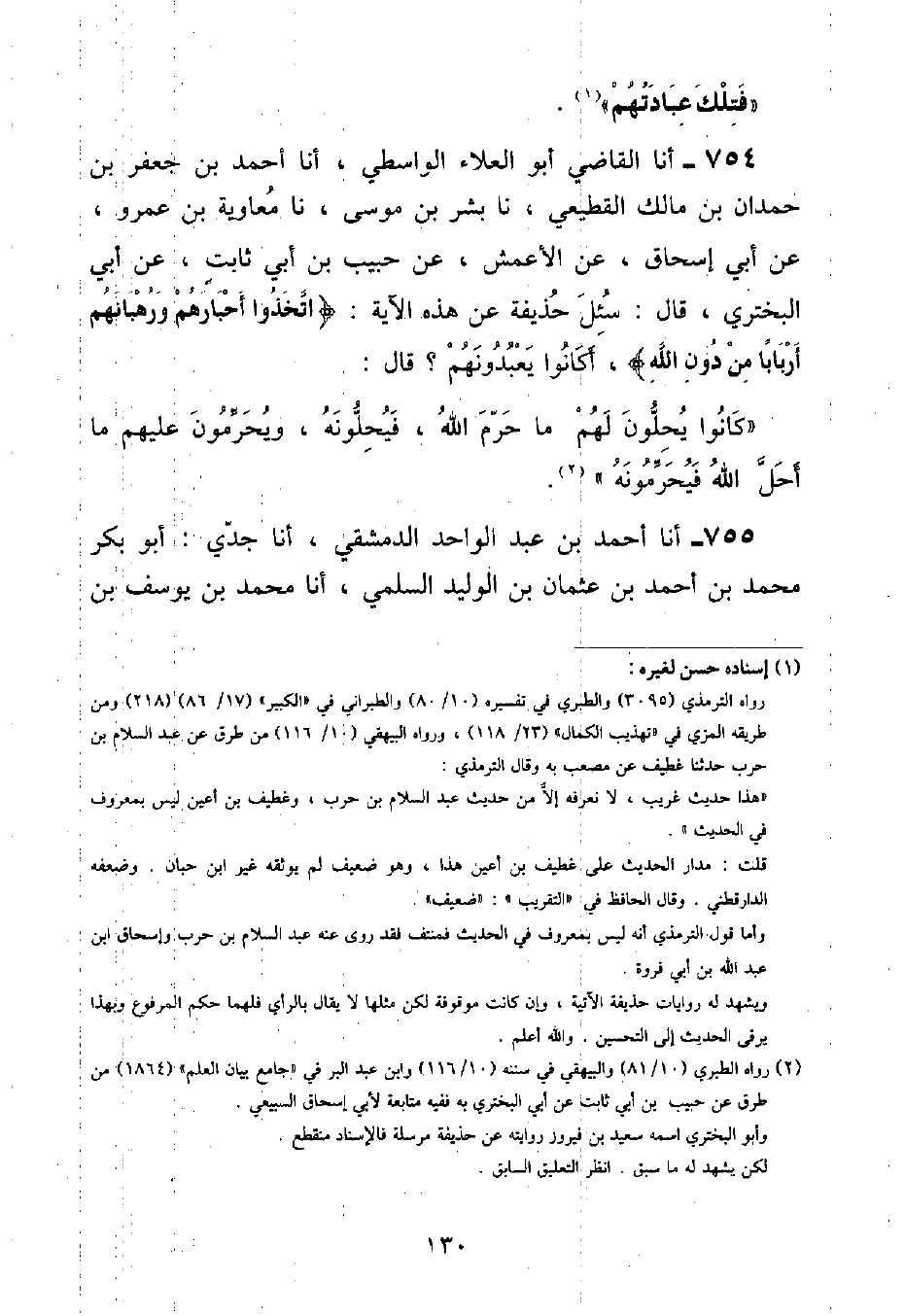 أنا أَحْمَدُ بْنُ عَبْدِ الْوَاحِدِ الدِّمَشْقِيُّ , أنا جَدِّي: أَبُو بَكْرٍ مُحَمَّدُ بْنُ أَحْمَدَ بْنِ عُثْمَانَ بْنِ الْوَلِيدِ السُّلَمِيُّ , أنا مُحَمَّدُ بْنُ يُوسُفَ بْنِ ⦗١٣١⦘ بِشْرٍ الْهَرَوِيُّ , أنا مُحَمَّدُ بْنُ حَمَّادٍ الطِّهْرَانِيُّ , أنا عَبْدُ الرَّزَّاقِ , أنا الثَّوْرِيُّ , عَنْ حَبِيبِ بْنِ أَبِي ثَابِتٍ , عَنْ أَبِي الْبَخْتَرِيِّ , قَالَ: سَأَلَ رَجُلٌ حُذَيْفَةَ , فَقَالَ: يَا أَبَا عَبْدِ اللَّهِ: أَرَأَيْتَ قَوْلَ اللَّهِ تَعَالَى: {اتَّخَذُوا أَحْبَارَهُمْ وَرُهْبَانَهُمْ أَرْبَابًا مِنْ دُونِ اللَّهِ} [التوبة: ٣١] أَكَانُوا يَعْبُدُونَهُمْ , قَالَ: «لَا , وَلَكِنَّهُمُ كَانُوا إِذَا أَحَلُّوا لَهُمْ شَيْئًا اسْتَحَلُّوهُ , وَإِذَا حَرَّمُوا عَلَيْهِمْ شَيْئًا حَرَّمُوهُ»