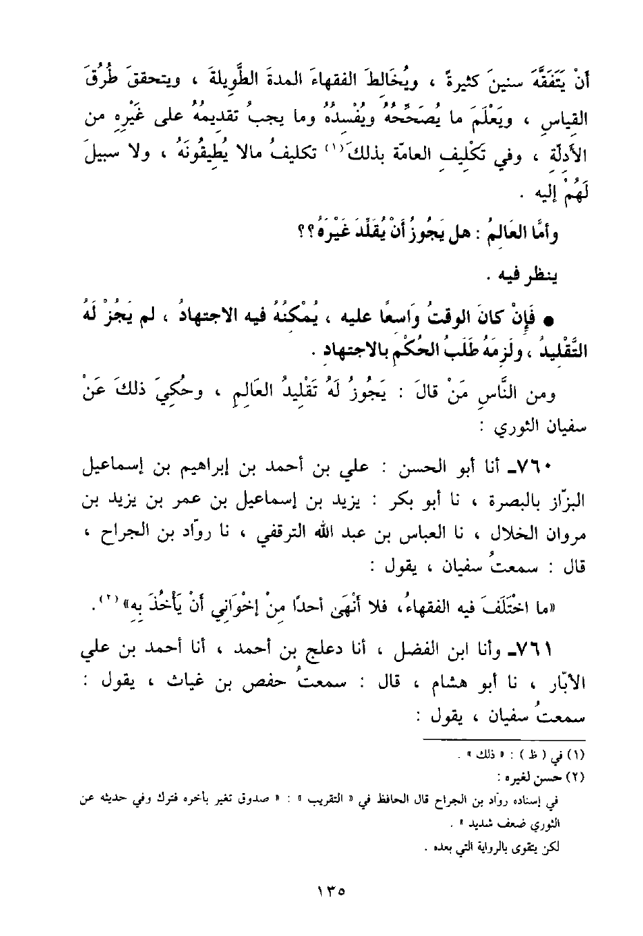 وَحُكِيَ ذَلِكَ عَنْ سُفْيَانَ الثَّوْرِيِّ: أنا أَبُو الْحَسَنِ عَلِيُّ بْنُ أَحْمَدَ بْنِ إِبْرَاهِيمَ بْنِ إِسْمَاعِيلَ الْبَزَّازُ بِالْبَصْرَةِ , نا أَبُو بَكْرٍ يَزِيدُ بْنُ إِسْمَاعِيلَ بْنِ عُمَرَ بْنِ يَزِيدَ بْنِ مَرْوَانَ الْخَلَّالُ , نا الْعَبَّاسُ بْنُ عَبْدِ اللَّهِ التَّرَقُّفِيُّ , نا رَوَّادُ بْنُ الْجَرَّاحِ , قَالَ: سَمِعْتُ سُفْيَانَ , يَقُولُ: «مَا اخْتَلَفَ فِيهِ الْفُقَهَاءُ , فَلَا أَنْهَى أَحَدًا مِنْ إِخْوَانِي أَنْ يَأْخُذَ بِهِ»