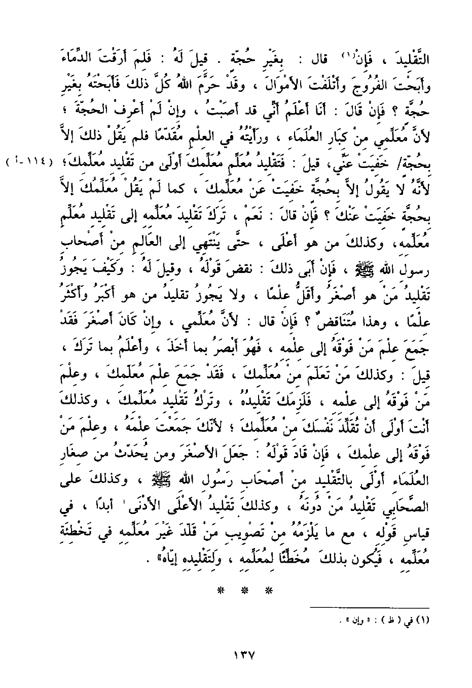 التَّقْلِيدُ , فَإِنْ قَالَ: بِغَيْرِ حُجَّةٍ قِيلَ لَهُ: فَلِمَ أَرَقْتَ الدِّمَاءَ وَأَبَحْتَ الْفُرُوجَ وَأَتْلَفْتَ الْأَمْوَالَ , وَقَدْ حَرَّمَ اللَّهُ كُلَّ ذَلِكَ فَأَبَحْتَهُ بِغَيْرِ حُجَّةٍ؟ فَإِنْ قَالَ: أَنَا أَعْلَمُ أَنِّي قَدْ أَصَبْتُ , وَإِنْ لَمْ أَعْرِفْ الْحُجَّةَ , لِأَنَّ مُعَلِّمِي مِنْ كِبَارِ الْعُلَمَاءِ , وَرَأَيْتُهُ فِي الْعِلْمِ مُقَدِّمًا فَلَمْ يَقُلْ ذَلِكَ إِلَّا بِحُجَّةٍ خَفِيَتْ عَنِّي , قِيلَ: فَتَقْلِيدُ مُعَلِّمِ مُعَلِّمِكَ أَوْلَى مِنْ تَقْلِيدِ مُعَلِّمِكَ , لِأَنَّهُ لَا يَقُولُ إِلَّا بِحُجَّةٍ خَفِيَتْ عَنْ مُعَلِّمِكَ , كَمَا لَمْ يَقُلْ مُعَلِّمُكَ إِلَّا بِحُجَّةٍ خَفِيَتْ عَنْكَ؟ فَإِنْ قَالَ: نَعَمْ , تَرَكَ تَقْلِيدَ مُعَلِّمِهِ إِلَى تَقْلِيدِ مُعَلِّمِ مُعَلِّمِهِ , وَكَذَلِكَ مَنْ هُوَ أَعْلَى , حَتَّى يَنْتَهِيَ إِلَى الْعَالِمِ مِنْ أَصْحَابِ رَسُولِ اللَّهِ صَلَّى اللهُ عَلَيْهِ وَسَلَّمَ , فَإِنْ أَبَى ذَلِكَ: نَقَضَ قَوْلَهُ , وَقِيلَ لَهُ: وَكَيْفَ يَجُوزُ تَقْلِيدُ مَنْ هُوَ أَصْغَرُ وَأَقَلُّ عِلْمًا , وَلَا يَجُوزُ تَقْلِيدُ مَنْ هُوَ أَكْبَرُ وَأَكْثَرُ عِلْمًا , وَهَذَا مُتَنَاقِضٌ؟ فَإِنْ قَالَ: لِأَنَّ مُعَلِّمِي , وَإِنْ كَانَ أَصْغَرَ فَقَدْ جَمَعَ عِلْمَ مَنْ فَوْقَهُ إِلَى عِلْمِهِ , فَهُوَ أَبْصَرُ بِمَا أَخَذَ , وَأَعْلَمُ بِمَا تَرَكَ , قِيلَ: وَكَذَلِكَ مَنْ تَعَلَّمَ مِنْ مُعَلِّمِكَ , فَقَدْ جَمَعَ عِلْمَ مُعَلِّمِكَ , وَعِلْمَ مَنْ فَوْقَهُ إِلَى عِلْمِهِ , فَلِزَمَكَ تَقْلِيدُهُ , وَتَرْكُ تَقْلِيدِ مُعَلِّمِكَ , وَكَذَلِكَ أَنْتَ أَوْلَى أَنْ تُقَلِّدَ نَفْسَكَ مِنْ مُعَلِّمِكَ , لِأَنَّكَ جَمَعْتَ عِلْمَهُ , وَعِلْمَ مَنْ فَوْقَهُ إِلَى عِلْمِكَ , فَإِنْ قَادَ قَوْلَهُ: جَعَلَ الْأَصْغَرَ وَمَنْ يُحَدِّثُ مِنْ صِغَارِ الْعُلَمَاءِ أَوْلَى بِالتَّقْلِيدِ مِنْ أَصْحَابِ رَسُولِ اللَّهِ صَلَّى اللهُ عَلَيْهِ وَسَلَّمَ , وَكَذَلِكَ عَلَى الصَّحَابِيِّ تَقْلِيدُ مَنْ دُونَهُ , وَكَذَلِكَ تَقْلِيدُ الْأَعْلَى الْأَدْنَى أَبَدًا , فِي قِيَاسِ قَوْلِهِ , مَعَ مَا يَلْزَمُهُ مِنْ تَصْوِيبِ مَنْ قَلَّدَ غَيْرَ مُعَلِّمِهِ فِي تَخْطِئَةِ مُعَلِّمِهِ , فَيَكُونُ بِذَلِكَ مُخَطِّئًا لِمُعَلِّمِهِ , وَلِتَقْلِيدِهِ إِيَّاهُ "