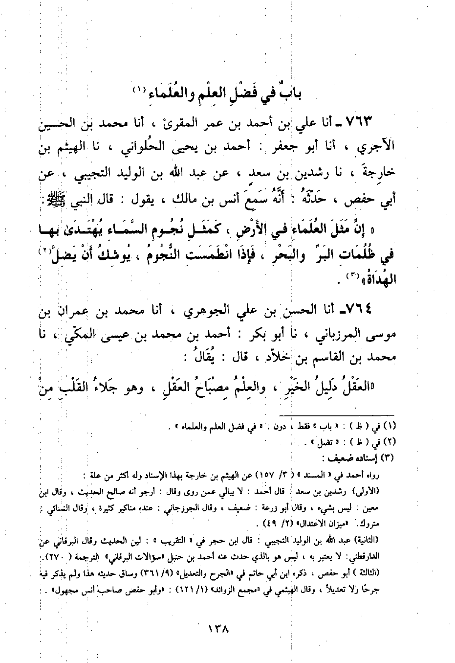 أنا عَلِيُّ بْنُ أَحْمَدَ بْنِ عُمَرَ الْمُقْرِئُ , أنا مُحَمَّدُ بْنُ الْحُسَيْنِ الْآجُرِّيُّ , أنا أَبُو جَعْفَرٍ: أَحْمَدُ بْنُ يَحْيَى الْحُلْوَانِيُّ , نا الْهَيْثَمُ بْنُ خَارِجَةَ , نا رِشْدِينُ بْنُ سَعْدٍ , عَنْ عَبْدِ اللَّهِ بْنِ الْوَلِيدِ التُّجِيبِيِّ , عَنْ أَبِي حَفْصٍ , حَدَّثَهُ: أَنَّهُ سَمِعَ أَنَسَ بْنَ مَالِكٍ , يَقُولُ: قَالَ النَّبِيُّ صَلَّى اللهُ عَلَيْهِ وَسَلَّمَ: «إِنَّ مَثَلَ الْعُلَمَاءِ فِي الْأَرْضِ , كَمَثَلِ نُجُومِ السَّمَاءِ يُهْتَدَى بِهَا فِي ظُلُمَاتِ الْبِرِّ وَالْبَحْرِ , فَإِذَا انْطَمَسَتِ النُّجُومُ , يُوشِكُ أَنْ يَضِلَّ الْهُدَاةُ»