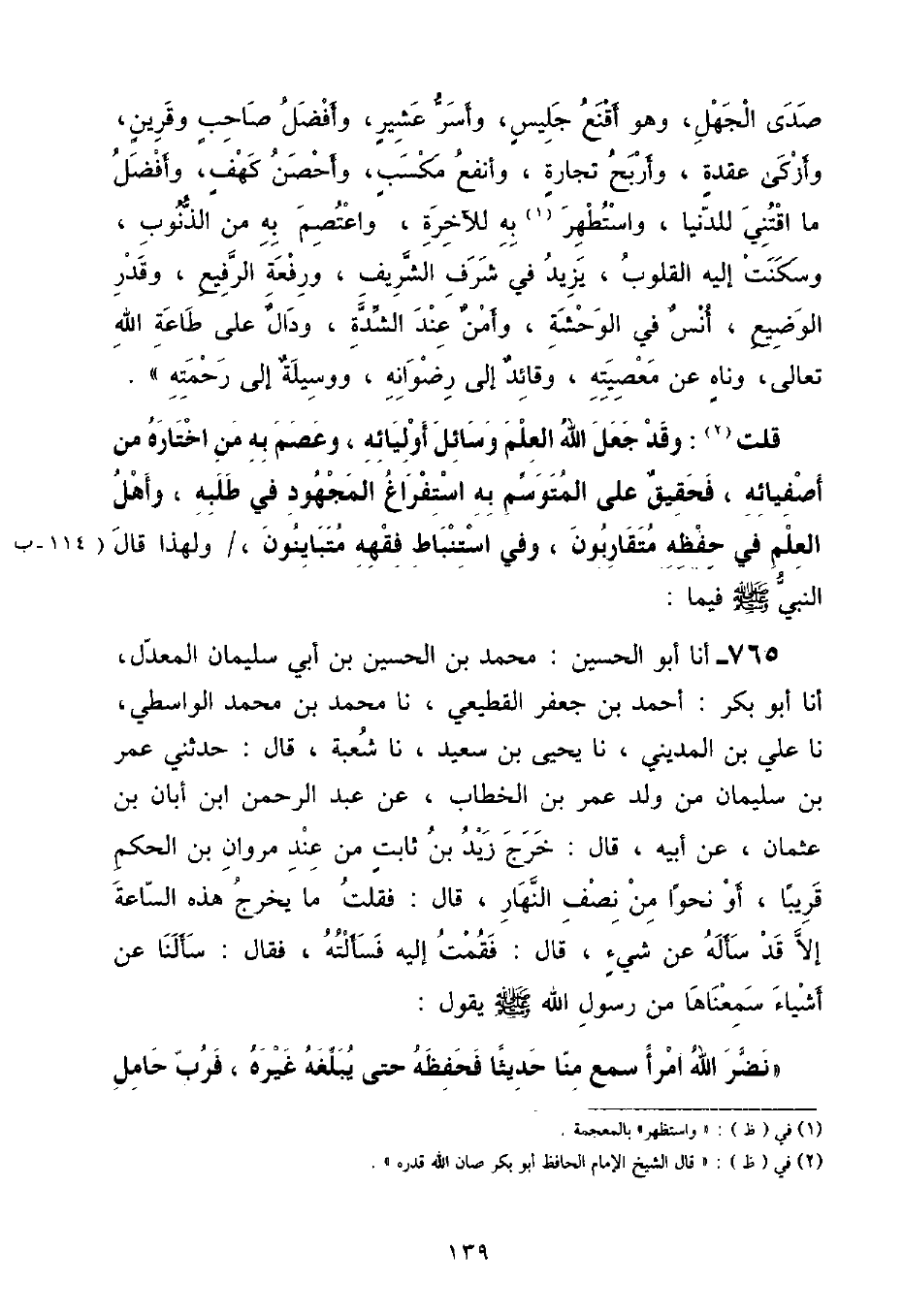 صَدَى الْجَهْلِ , وَهُوَ أَقْنَعُ جَلِيسٍ , وَأَسَرُّ عَشِيرٍ , وَأَفْضَلُ صَاحِبٍ وَقَرِينٍ , وَأَزْكَى عُقْدَةٍ , وَأَرْبَحُ تِجَارَةٍ , وَأَنْفَعُ مَكْسَبٍ , وَأَحْصَنُ كَهْفٍ , وَأَفْضَلُ مَا اقْتُنِيَ لِلدُّنْيَا , وَاسْتُطْهِرَ بِهِ لِلْآخِرَةِ , وَاعْتُصِمَ بِهِ مِنَ الذُّنُوبِ , وَسَكَنَتْ إِلَيْهِ الْقُلُوبُ , يَزِيدُ فِي شَرَفِ الشَّرِيفِ , وَرِفْعَةِ الرَّفِيعِ , وَقَدْرِ الْوَضِيعِ , أُنْسٌ فِي الْوَحْشَةِ , وَأَمْنٌ عِنْدَ الشِّدَّةِ , وَدَالٌّ عَلَى طَاعَةِ اللَّهِ تَعَالَى , وَحَدَّثَنَاهُ عَنْ مَعْصِيَتِهِ , وَقَائِدٌ إِلَى رِضْوَانِهِ , وَوَسِيلَةٌ إِلَى رَحْمَتِهِ» قُلْتُ: وَقَدْ جَعَلَ اللَّهُ الْعِلْمَ وَسَائِلَ أَوْلِيَائِهِ , وَعَصَمَ بِهِ مَنَ اخْتَارَهُ مِنْ أَصْفِيَائِهِ , فَحَقِيقٌ عَلَى الْمُتَوَسِّمِ بِهِ اسْتِفْرَاغُ الْمَجْهُودِ فِي طَلَبِهِ , وَأَهْلُ الْعِلْمِ فِي حِفْظِهِ مُتَقَارِبُونَ , وَفِي اسْتِنْبَاطِ فِقْهِهِ مُتَبَايِنُونَ , وَلِهَذَا قَالَ النَّبِيُّ صَلَّى اللهُ عَلَيْهِ وَسَلَّمَ فِيمَا: