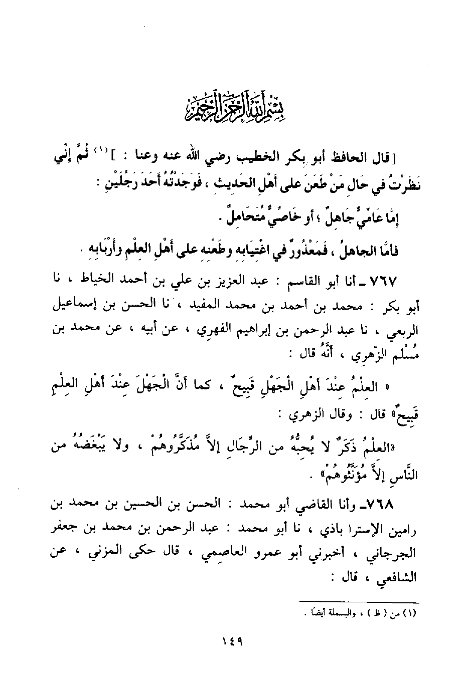 وأنا الْقَاضِي أَبُو مُحَمَّدٍ الْحَسَنُ بْنُ الْحُسَيْنِ بْنِ مُحَمَّدِ بْنِ رَامِينَ الْإِسْتَرَا بَاذِيُّ , نا أَبُو مُحَمَّدٍ عَبْدُ الرَّحْمَنِ بْنُ مُحَمَّدِ بْنِ جَعْفَرٍ الْجُرْجَانِيُّ , أَخْبَرَنِي أَبُو عَمْرٍو الْعَاصِمِيُّ , قَالَ: حَكَى الْمُزَنِيُّ , عَنِ الشَّافِعِيِّ , قَالَ ⦗١٥٠⦘: «الْعِلْمُ جَهْلٌ عِنْدَ أَهْلِ الْجَهْلِ , كَمَا أَنَّ الْجَهْلَ جَهْلٌ عِنْدَ أَهْلِ الْعِلْمِ» , وَأَنْشَدَ فِيهِ: «
