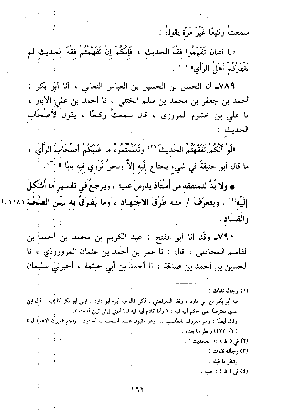 أنا الْحَسَنُ بْنُ الْحُسَيْنِ بْنِ الْعَبَّاسِ النِّعَالِيُّ , أنا أَبُو بَكْرٍ أَحْمَدُ بْنُ جَعْفَرِ بْنِ مُحَمَّدِ بْنِ سَلْمٍ الْخُتَّلِيُّ , نا أَحْمَدُ بْنُ عَلِيٍّ الْأَبَّارُ , نا عَلِيُّ بْنُ خَشْرَمٍ الْمَرْوَزِيُّ , قَالَ: سَمِعْتُ وَكِيعًا , يَقُولُ لِأَصْحَابِ الْحَدِيثِ: «لَوْ أَنَّكُمْ تَفَقَّهْتُمُ الْحَدِيثَ وَتَعَلَّمْتُمُوهُ مَا غَلَبَكُمْ أَصْحَابُ الرَّأْيِ , مَا قَالَ أَبُو حَنِيفَةَ فِي» شَيْءٍ يُحْتَاجُ إِلَيْهِ إِلَّا وَنَحْنُ نَرْوِي فِيهِ بَابًا وَلَا بُدَّ لِلْمُتَفَقِّهِ مِنْ أُسْتَاذٍ يَدْرُسُ عَلَيْهِ , وَيَرْجِعُ فِي تَفْسِيرِ مَا أَشْكَلَ إِلَيْهِ , وَيَتَعَرَّفُ مِنْهُ طُرُقَ الِاجْتِهَادِ , وَمَا يُفَرِّقُ بِهِ بَيْنَ الصِّحَّةِ وَالْفَسَادِ
