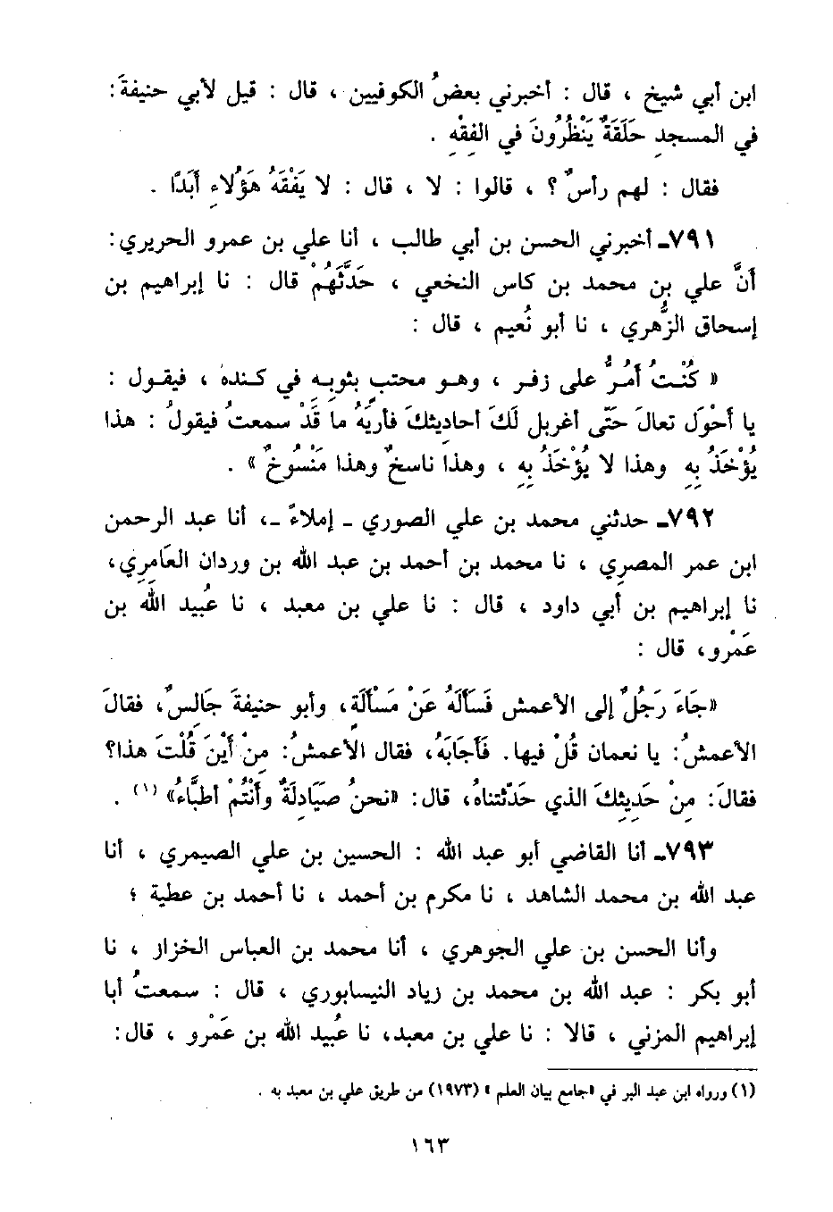حَدَّثَنِي مُحَمَّدُ بْنُ عَلِيٍّ الصُّورِيُّ , إِمْلَاءً , أنا عَبْدُ الرَّحْمَنِ بْنُ عُمَرَ الْمِصْرِيُّ , نا مُحَمَّدُ بْنُ أَحْمَدَ بْنِ عَبْدِ اللَّهِ بْنِ وَرْدَانَ الْعَامِرِيُّ , نا إِبْرَاهِيمُ بْنُ أَبِي دَاوُدَ , قَالَ: نا عَلِيُّ بْنُ مَعْبَدٍ , نا عُبَيْدُ اللَّهِ بْنُ عَمْرٍو , قَالَ: جَاءَ رَجُلٌ إِلَى الْأَعْمَشِ فَسَأَلَهُ عَنْ مَسْأَلَةٍ , وأَبُو حَنِيفَةَ جَالِسٌ , فَقَالَ الْأَعْمَشٌ: يَا نُعْمَانُ قُلْ فِيهَا فَأَجَابَهُ , فَقَالَ الْأَعْمَشُ: «مِنْ أَيْنَ قُلْتَ هَذَا؟» فَقَالَ: مِنْ حَدِيثِكَ الَّذِي حَدَّثْتَنَاهُ , قَالَ: «نَحْنُ صَيَادِلَةٌ وَأَنْتُمْ أَطِبَّاءُ»