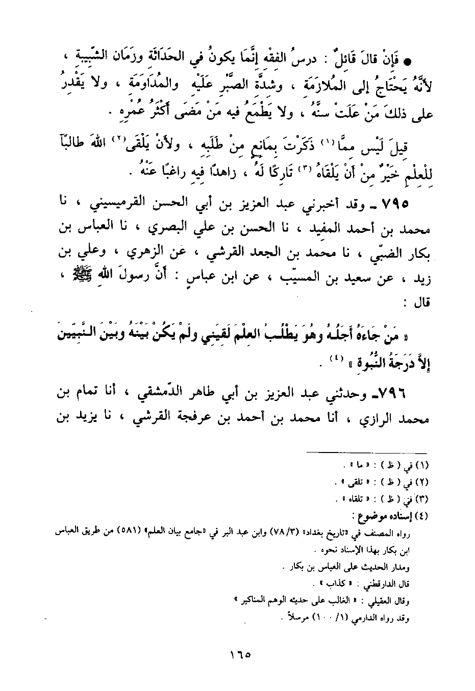 وَقَدْ أَخْبَرَنِي عَبْدُ الْعَزِيزِ بْنُ أَبِي الْحَسَنِ الْقِرْمِيسِينِيُّ , نا مُحَمَّدُ بْنُ أَحْمَدَ الْمُفِيدُ , نا الْحَسَنُ بْنُ عَلِيٍّ الْبَصْرِيُّ , نا الْعَبَّاسُ بْنُ بَكَّارٍ الضَّبِّيُّ , نا مُحَمَّدُ بْنُ الْجَعْدِ الْقُرَشِيُّ , عَنِ الزُّهْرِيِّ , وَعَلِيِّ بْنِ زَيْدٍ , عَنْ سَعِيدِ بْنِ الْمُسَيِّبِ , عَنِ ابْنِ عَبَّاسٍ: أَنَّ رَسُولَ اللَّهِ صَلَّى اللهُ عَلَيْهِ وَسَلَّمَ , قَالَ: «مَنْ جَاءَهُ أَجَلُهُ وَهُوَ يَطْلُبُ الْعِلْمَ لَقِيَنِي وَلَمْ يَكُنْ بَيْنَهُ وَبَيْنَ النَّبِيِّينَ إِلَّا دَرَجَةُ النُّبُوَّةِ»