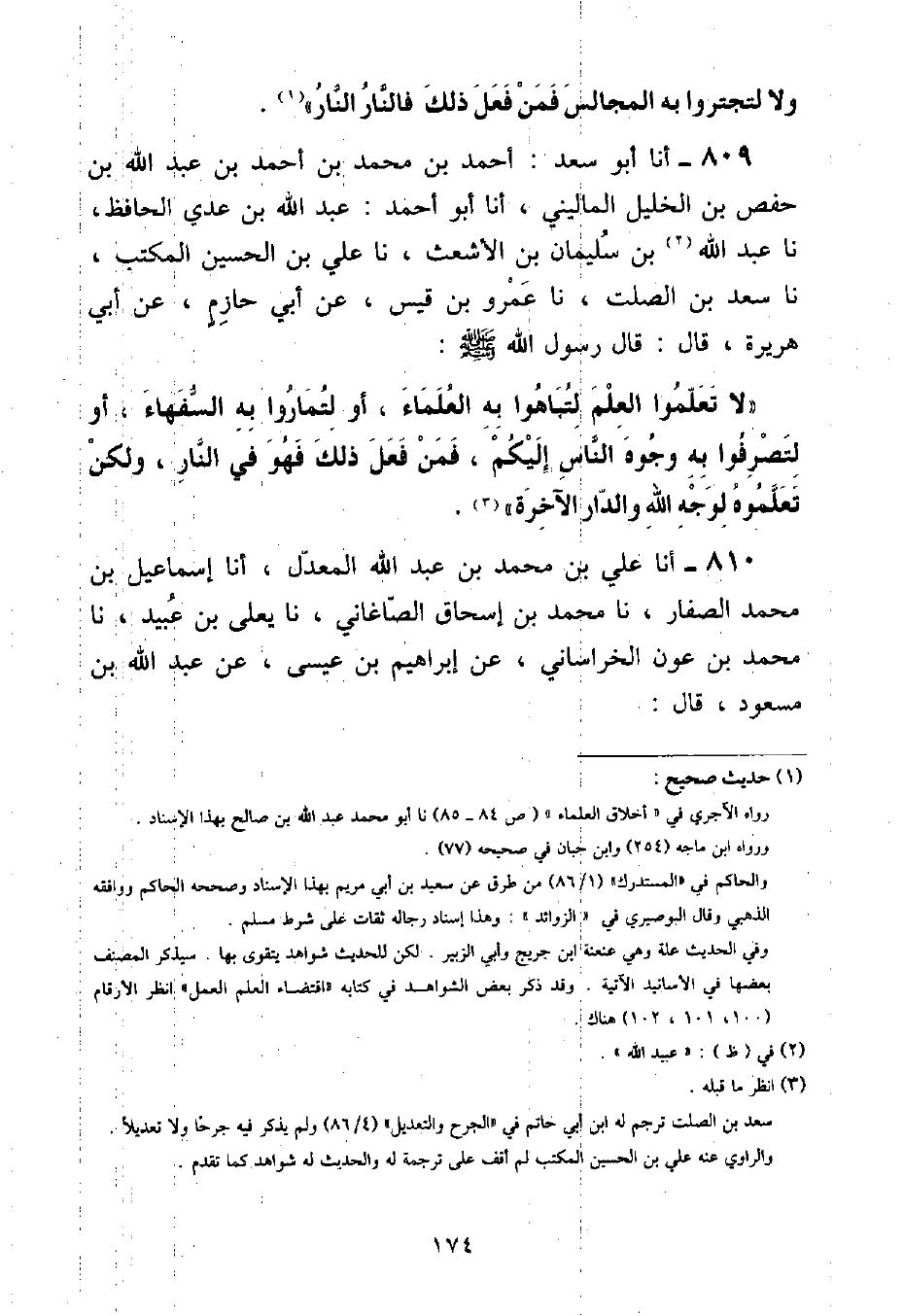 أنا أَبُو سَعْدٍ أَحْمَدُ بْنُ مُحَمَّدِ بْنِ أَحْمَدَ بْنِ عَبْدِ اللَّهِ بْنِ حَفْصِ بْنِ الْخَلِيلِ الْمَالِينِيُّ , أنا أَبُو أَحْمَدَ عَبْدُ اللَّهِ بْنُ عَدِيٍّ الْحَافِظُ , نا عَبْدُ اللَّهِ بْنُ سُلَيْمَانَ بْنِ الْأَشْعَثَ , نا عَلِيُّ بْنُ الْحُسَيْنِ الْمُكْتِبُ , نا سَعْدُ بْنُ الصَّلْتِ , نا عَمْرُو بْنُ قَيْسٍ , عَنْ أَبِي حَازِمٍ , عَنْ أَبِي هُرَيْرَةَ , قَالَ: قَالَ رَسُولُ اللَّهِ صَلَّى اللهُ عَلَيْهِ وَسَلَّمَ: «لَا تَعَلَّمُوا الْعِلْمَ لِتُبَاهُوا بِهِ الْعُلَمَاءَ , أَوْ لِتُمَارُوا بِهِ السُّفَهَاءَ , أَوْ لِتَصْرِفُوا بِهِ وُجُوهَ النَّاسِ إِلَيْكُمْ , فَمَنْ فَعَلَ ذَلِكَ فَهُوَ فِي النَّارِ , وَلَكِنْ تَعَلَّمُوهُ لِوَجْهِ اللَّهِ وَالدَّارِ الْآخِرَةِ»