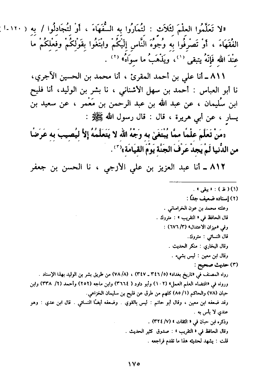 أنا عَلِيُّ بْنُ أَحْمَدَ الْمُقْرِئُ , أنا مُحَمَّدُ بْنُ الْحُسَيْنِ الْآجُرِّيُّ , نا أَبُو الْعَبَّاسِ أَحْمَدُ بْنُ سَهْلٍ الْأُشْنَانِيُّ , نا بِشْرُ بْنُ الْوَلِيدِ , أنا فُلَيْحُ بْنُ سُلَيْمَانَ , عَنْ عَبْدِ اللَّهِ بْنِ عَبْدِ الرَّحْمَنِ بْنِ مَعْمَرٍ , عَنْ سَعِيدِ بْنِ يَسَارٍ , عَنْ أَبِي هُرَيْرَةَ , قَالَ: قَالَ رَسُولُ اللَّهِ صَلَّى اللهُ عَلَيْهِ وَسَلَّمَ: «مَنْ تَعَلَّمَ عِلْمًا مِمَّا يَبْتَغِي بِهِ وَجْهَ اللَّهِ لَا يَتَعَلَّمُهُ إِلَّا لَيُصِيبَ بِهِ عَرَضًا مِنَ الدُّنْيَا لَمْ يَجِدْ عَرْفَ الْجَنَّةِ يَوْمَ الْقِيَامَةِ»