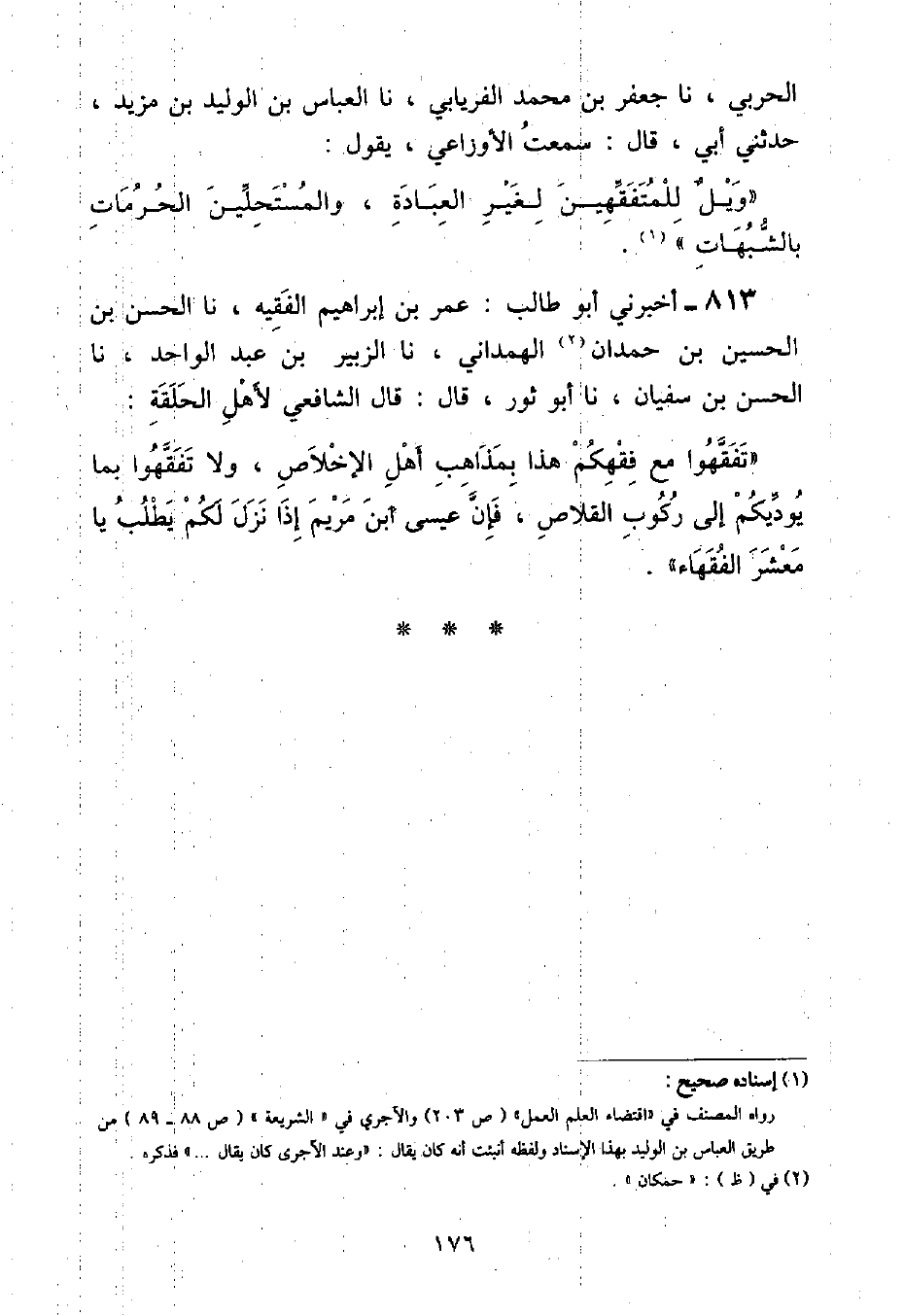 أَخْبَرَنِي أَبُو طَالِبٍ: عُمَرُ بْنُ إِبْرَاهِيمَ الْفَقِيهُ , نا الْحَسَنُ بْنُ الْحُسَيْنِ بْنِ حَمْدَانَ الْهَمْدَانِيُّ , نا الزُّبَيْرُ بْنُ عَبْدِ الْوَاحِدِ , نا الْحَسَنُ بْنُ سُفْيَانَ , نا أَبُو ثَوْرٍ , قَالَ: قَالَ الشَّافِعِيُّ لِأَهْلِ الْحَلَقَةِ: «تَفَقَّهُوا مَعَ فِقْهِكُمْ هَذَا بِمَذَاهِبِ أَهْلِ الْإِخْلَاصِ , وَلَا تَفَقَّهُوا بِمَا يُوَدِّيكُمْ إِلَى رُكُوبِ الْقِلَاصِ , فَإِنَّ عِيسَى ابْنَ مَرْيَمَ إِذَا نَزَلَ لَكُمْ يَطْلُبُ يَا مَعْشَرَ الْفُقَهَاءِ»