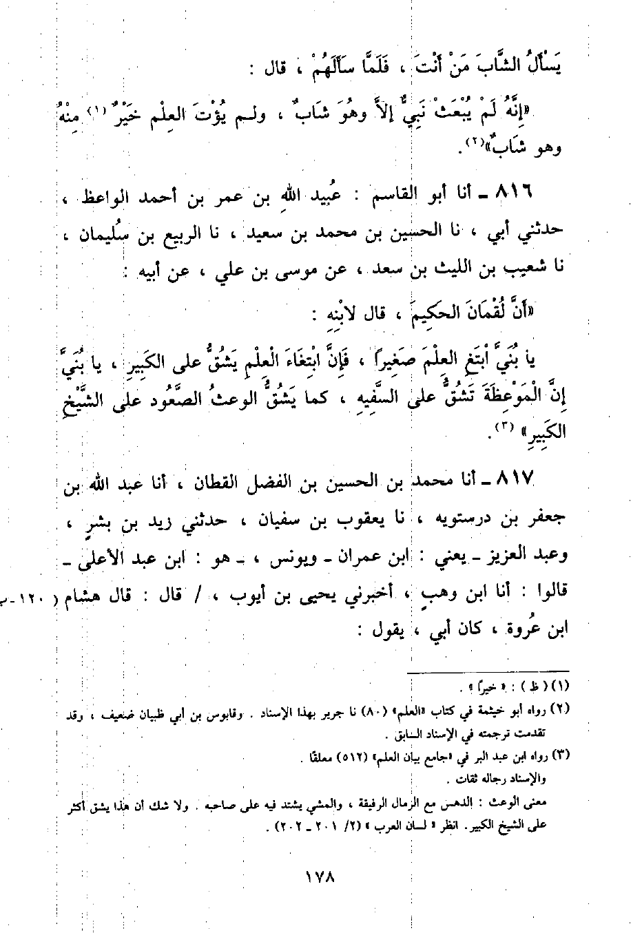أنا أَبُو الْقَاسِمِ عُبَيْدُ اللَّهِ بْنُ عُمَرَ بْنِ أَحْمَدَ الْوَاعِظُ , حَدَّثَنِي أَبِي , نا الْحُسَيْنُ بْنُ مُحَمَّدِ بْنِ سَعِيدٍ , نا الرَّبِيعُ بْنُ سُلَيْمَانَ , نا شُعَيْبُ بْنُ اللَّيْثِ بْنِ سَعْدٍ , عَنْ مُوسَى بْنِ عَلِيٍّ , عَنْ أَبِيهِ: أَنَّ لُقْمَانَ الْحَكِيمَ , قَالَ لِابْنِهِ: «يَا بُنَيَّ ابْتَغِ الْعِلْمَ صَغِيرًا , فَإِنَّ ابْتِغَاءَ الْعِلْمِ يَشُقُّ عَلَى الْكَبِيرِ , يَا بُنَيَّ إِنَّ الْمَوْعِظَةَ تَشُقُّ عَلَى السَّفِيهِ , كَمَا يَشُقُّ الْوَعْثُ الصَّعُودَ عَلَى الشَّيْخِ الْكَبِيرِ»