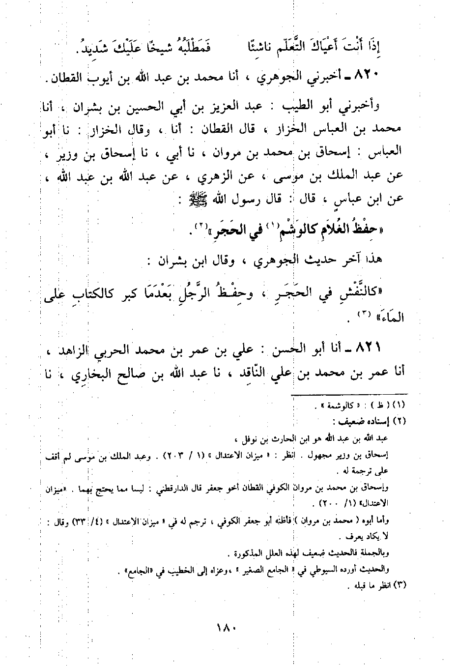 أَخْبَرَنِي الْجَوْهَرِيُّ , أنا مُحَمَّدُ بْنُ عَبْدِ اللَّهِ بْنِ أَيُّوبَ الْقَطَّانُ , وأَخْبَرَنِي أَبُو الطَّيِّبِ عَبْدُ الْعَزِيزِ بْنِ أَبِي الْحُسَيْنِ بْنِ بِشْرَانِ , أنا مُحَمَّدُ بْنُ الْعَبَّاسِ الْخَزَّازُ , قَالَ الْقَطَّانُ: أَنَا وَقَالَ الْخَزَّازُ: نا أَبُو الْعَبَّاسِ إِسْحَاقُ بْنُ مُحَمَّدِ بْنِ مَرْوَانَ , نا أَبِي , نا إِسْحَاقُ بْنُ وَزِيرٍ , عَنْ عَبْدِ الْمَلِكِ بْنِ مُوسَى , عَنِ الزُّهْرِيِّ , عَنْ عَبْدِ اللَّهِ بْنِ عَبْدِ اللَّهِ , عَنِ ابْنِ عَبَّاسٍ , قَالَ: قَالَ رَسُولُ اللَّهِ صَلَّى اللهُ عَلَيْهِ وَسَلَّمَ: «حِفْظُ الْغُلَامِ كَالْوَشْمِ فِي الْحَجَرِ» هَذَا آخِرُ حَدِيثِ الْجَوْهَرِيِّ , وَقَالَ ابْنُ بِشْرَانِ: كَالنَّقْشِ فِي الْحَجَرِ , وَحِفْظُ الرَّجُلِ بَعْدَمَا كَبُرَ كَالْكِتَابِ عَلَى الْمَاءِ