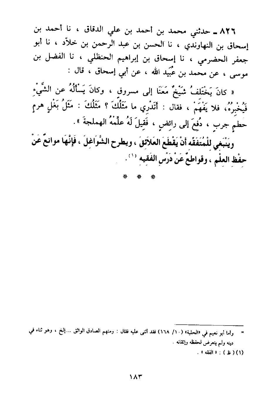 حَدَّثَنِي مُحَمَّدُ بْنُ أَحْمَدَ بْنِ عَلِيٍّ الدَّقَّاقُ , نا أَحْمَدُ بنُ إِسْحَاقَ بْنِ النَّهَاوَنْدِيِّ , نا الْحَسَنُ بْنُ عَبْدِ الرَّحْمَنِ بْنِ خَلَّادٍ , نا أَبُو جَعْفَرٍ الْحَضْرَمِيُّ , نا إِسْحَاقُ بْنُ إِبْرَاهِيمَ الْحَنْظَلِيُّ , نا الْفَضْلُ بْنُ مُوسَى , عَنْ مُحَمَّدِ بْنِ عُبَيْدِ اللَّهِ , عَنْ أَبِي إِسْحَاقَ , قَالَ: كَانَ يَخْتَلِفُ شَيْخٌ مَعَنَا إِلَى مَسْرُوقٍ , وَكَانَ يَسْأَلُهُ عَنِ الشَّيْءِ فَيُخْبِرُهُ , فَلَا يَفْهَمُ , فَقَالَ: أَتَدْرِي مَا مَثَلُكَ؟ «مَثَلُكَ مَثَلُ بَغْلٍ هَرِمٍ حَطْمٍ جَرِبٍ , دُفِعَ إِلَى رَائِضٍ , فَقِيلَ لَهُ عَلِّمْهُ الْهَمْلَجَةَ» وَيَنْبَغِي لِلْمُتَفَقِّهِ أَنْ يَقْطَعَ الْعَلَائِقَ , وَيَطْرَحَ الشَّوَاغِلَ , فَإِنَّهَا مَوَانِعُ عَنْ حِفْظِ الْعِلْمِ , وَقَوَاطِعُ عَنْ دَرْسِ الْفَقِيهِ