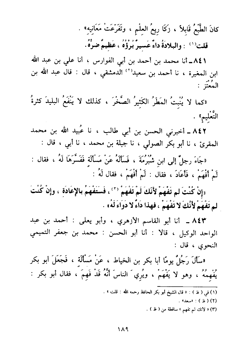 أَخْبَرَنِي الْحَسَنُ بْنُ أَبِي طَالِبٍ , نا عُبَيْدُ اللَّهِ بْنُ مُحَمَّدٍ الْمُقْرِئُ , نا أَبُو بَكْرٍ الصُّولِيُّ , نا جَبَلَةُ بْنُ مُحَمَّدٍ , نا أَبِي: قَالَ جَاءَ رَجُلٌ إِلَى ابْنِ شُبْرُمَةَ , فَسَأَلَهُ عَنْ مَسْأَلَةٍ , فَفَسَّرَهَا لَهُ , فَقَالَ: لَمْ أَفْهَمْ , فَأَعَادَ , فَقَالَ: لَمْ أَفْهَمْ , فَأَعَادَ , فَقَالَ: لَمْ أَفْهَمْ , فَقَالَ لَهُ: «إِنْ كُنْتَ لَمْ تَفْهَمْ لِأَنَّكَ لَمْ تَفْهَمْ , فَسَتَفْهَمُ بِالْإِعَادَةِ , وَإِنْ كُنْتَ لَمْ تَفْهَمْ لِأَنَّكَ لَا تَفْهَمُ , فَهَذَا دَاءٌ لَا دَوَاءَ لَهُ»