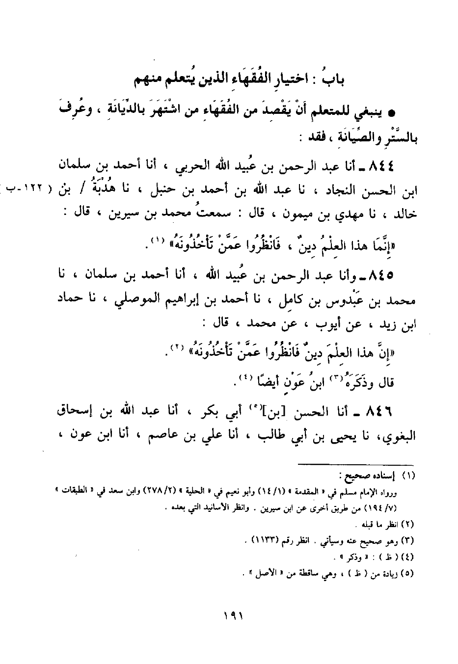 أنا الْحَسَنُ بْنُ أَبِي بَكْرٍ , أنا عَبْدُ اللَّهِ بْنُ إِسْحَاقَ الْبَغَوِيُّ , نا يَحْيَى بْنُ أَبِي طَالِبٍ , أنا عَلِيُّ بْنُ عَاصِمٍ , أنا ابْنُ عَوْنٍ , ⦗١٩٢⦘ قَالَ: قَالَ: مُحَمَّدُ بْنُ سِيرِينَ: إِنَّ «هَذَا الْعِلْمَ دِينٌ فَانْظُرُوا عَمَّنْ تَأْخُذُونَهُ» وَيَكُونُ قَدْ وَسَمَ نَفْسَهُ بِآدَابِ الْعِلْمِ , مِنَ اسْتِعْمَالِ: الصَّبْرِ وَالْحِلْمِ , وَالتَّوَاضُعِ لِلطَّالِبِينَ , وَالرِّفْقِ بِالْمُتَعَلِّمِينَ , وَلِينِ الْجَانِبِ , وَمُدَارَاةِ الصَّاحِبِ , وَقَوْلِ الْحَقِّ , وَالنَّصِيحَةِ لِلْخَلْقِ , وَغَيْرِ ذَلِكَ مِنَ الْأَوْصَافِ الْحَمِيدَةِ , وَالنُّعُوتِ الْجَمِيلَةِ