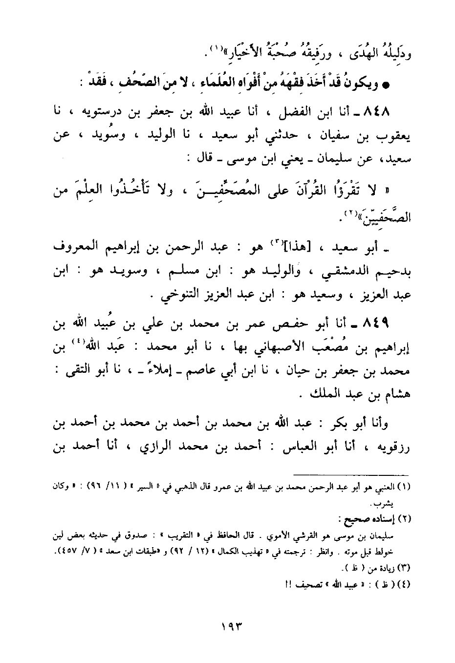 أنا ابْنُ الْفَضْلِ , أنا عُبَيْدُ اللَّهِ بْنُ جَعْفَرِ بْنِ دُرَسْتُوَيْهِ , نا يَعْقُوبُ بْنُ سُفْيَانَ , حَدَّثَنِي أَبُو سَعِيدٍ , نا الْوَلِيدُ , وَسُوَيْدٌ , عَنْ سَعِيدٍ , عَنْ سُلَيْمَانَ يَعْنِي ابْنَ مُوسَى , قَالَ: «لَا تَقْرَءُوا الْقُرْآنَ عَلَى الْمُصَحِّفِينَ , وَلَا تَأْخُذُوا الْعِلْمَ مِنَ الصَّحَفِيِّينَ» أَبُو سَعِيدٍ هَذَا هُوَ: عَبْدُ الرَّحْمَنِ بْنُ إِبْرَاهِيمَ الْمَعْرُوفُ بِدُحَيْمٍ الدِّمَشْقِيُّ , وَالْوَلِيدُ هُوَ: ابْنُ مُسْلِمٍ , وَسُوَيْدُ هُوَ: ابْنُ عَبْدِ الْعَزِيزِ، وَسَعِيدٌ هُوَ: ابْنُ عَبْدِ الْعَزِيزِ التَّنُوخِيُّ