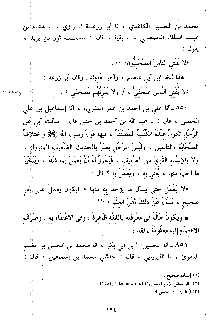 أنا عَلِيُّ بْنُ أَحْمَدَ بْنِ عُمَرَ الْمُقْرِئُ , أنا إِسْمَاعِيلُ بْنُ عَلِيٍّ الْخُطَبِيُّ , قَالَ: نا عَبْدُ اللَّهِ بْنُ أَحْمَدَ بْنِ حَنْبَلٍ , قَالَ: سَأَلْتُ أَبِي عَنٍ الرَّجُلِ , تَكُونُ عِنْدَهُ الْكُتُبُ الْمُصَنَّفَةُ , فِيهَا قَوْلُ رَسُولِ اللَّهِ صَلَّى اللهُ عَلَيْهِ وَسَلَّمَ وَاخْتِلَافُ الصَّحَابَةِ وَالتَّابِعِينَ , وَلَيْسَ لِلرَّجُلِ بَصَرٌ بِالْحَدِيثِ الضَّعِيفِ الْمَتْرُوكِ , وَلَا بِالْإِسْنَادِ الْقَوِيِّ مِنَ الضَّعِيفِ , فَيَجُوزُ لَهُ أَنْ يَعْمَلَ بِمَا شَاءَ , وَيَتَخَيَّرَ مَا أَحَبَّ مِنْهَا , يُفْتِي بِهِ , وَيَعْمَلُ بِهِ؟ قَالَ: «لَا يَعْمَلُ حَتَّى يَسْأَلَ مَا يُؤْخَذُ بِهِ مِنْهَا , فَيَكُونُ يَعْمَلُ عَلَى أَمْرٍ صَحِيحٍ , يَسْأَلُ عَنْ ذَلِكَ أَهْلَ الْعِلْمِ» وَيَكُونُ حَالُهُ فِي مَعْرِفَتِهِ بِالْفِقْهِ ظَاهِرَةً , وَفِي الِاعْتِنَاءِ بِهِ وَصَرْفِ الِاهْتِمَامِ إِلَيْهِ مَعْلُومَةً