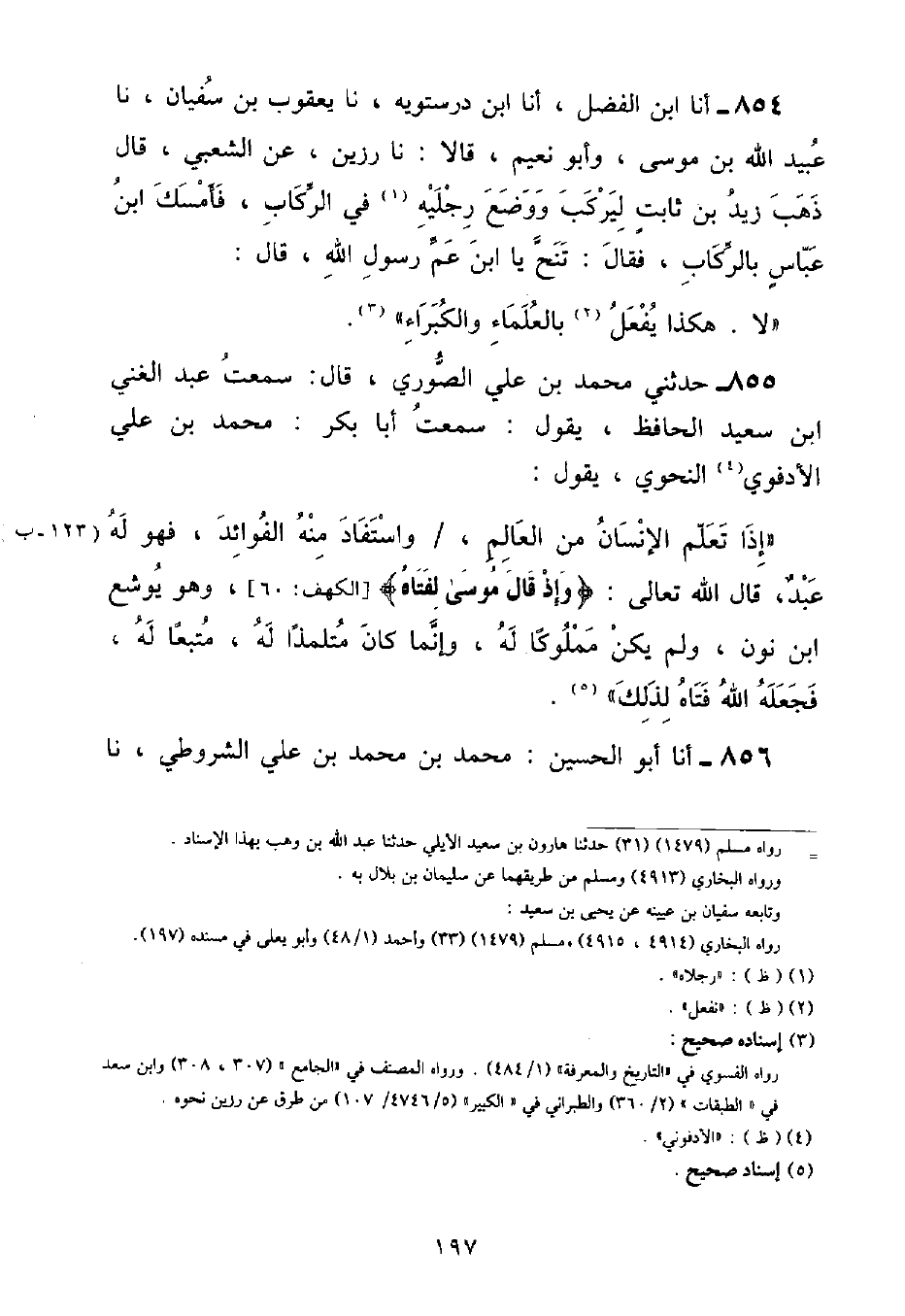 أنا ابْنُ الْفَضْلِ , أنا ابْنُ دُرَسْتُوَيْهِ , نا يَعْقُوبُ بْنُ سُفْيَانَ , نا عُبَيْدُ اللَّهِ بْنُ مُوسَى , وأَبُونُعَيْمٍ , قَالَا: نا رَزِينٌ , عَنِ الشَّعْبِيِّ , قَالَ ذَهَبَ زَيْدُ بْنُ ثَابِتٍ لِيَرْكَبَ وَوَضَعَ رِجْلَيْهِ فِي الرِّكَابِ , فَأَمْسَكَ ابْنُ عَبَّاسٍ بِالرِّكَابِ , فَقَالَ: تَنَحَّ يَا ابْنَ عَمِّ رَسُولِ اللَّهِ , قَالَ: «لَا هَكَذَا يُفْعَلُ بِالْعُلَمَاءِ وَالْكُبَرَاءُ»